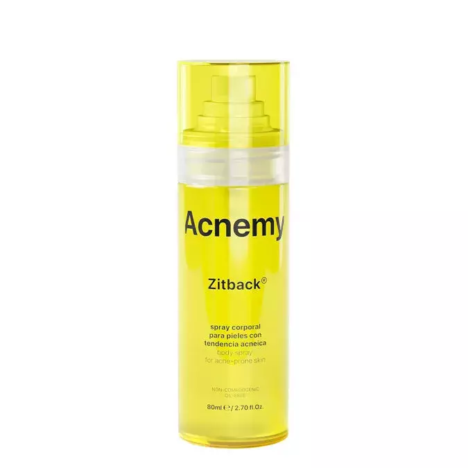 Acnemy - Zitback - produkts pret pūtītem, izsmidzināms spreja veidā, kas atvieglo to lietošanu. Lieliski piemērots pūtītēm, kas rodas uz muguras, kā arī kakla un dekoltē zonas. Satur glikolskābi un salicilskābi, kurām piemīt pīlinga īpašības, stimulē šūnu atjaunošanos un iekaisumu dzīšanu. Turklāt tās dziļi attīra poras, kas novērš pītīšu veidošanos nākotnē. Vērtīgais niacinamīda saturs nodrošina tauku dziedzeru regulāru darbību, kā arī novērš to aizsērēšanu. Turklāt tas izlīdzina ādas toni, kas var būt nevienmērīgs aknes pigmentāciju dēļ. Visa produkta satura pamatā ir citrona hidrolats, kas atbilstoši atsvaidzina un tonizē ādu, turklāt tam ir arī stimulējoša un atjaunojoša iedarbība uz ādu. Skābes formulas sastāvā ir iekapsulētas, tāpēc kairinājuma risks ir samazināts līdz minimumam. Produkta pH ir 3,5-3,8, un tā formula ir vegāna.