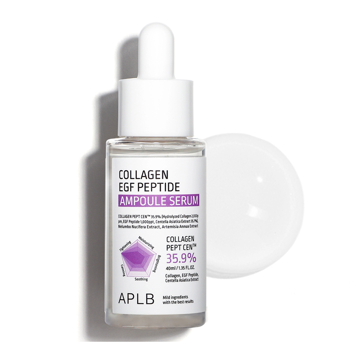 APLB - Collagen EGF Peptide Ampoule Serum - serums ar vieglu želejveida konsistenci, kas nodrošina intensīvu mitrināšanu, atjaunošanu un nostiprinošu efektu. Tas satur Āzijas centellas ekstraktu un trīs no tā iegūtās aktīvās vielas – aziātskābi, madekasskābi un asiatikozīdu. Šī kombinācija sniedz visaptverošu atjaunojošu un pretiekaisuma iedarbību. Papildus sh-oligopeptide-1 un hidrolizētais kolagēns paaugstina ādas mitruma līmeni, kā arī EGF peptīds uzlabo ādas stingrību, blīvumu un elastību. Kompozīciju papildina skvalāns, kas veicina aktīvo vielu uzsūkšanos, vienlaikus barojot un mitrinot ādu. Rezultātā serums ne tikai nomierina sausu un dehidrētu ādu, bet arī palīdz atjaunot līdzsvaru jutīgai un kairinātai ādai. Pateicoties savām pretnovecošanās īpašībām, tas ir piemērots arī ādai ar pirmajām novecošanās pazīmēm vai samazinātu tvirtumu. Produkta pH ir viegli skābs – 5.0-6.5. Formula nesatur smaržvielas un minerāleļļas.
