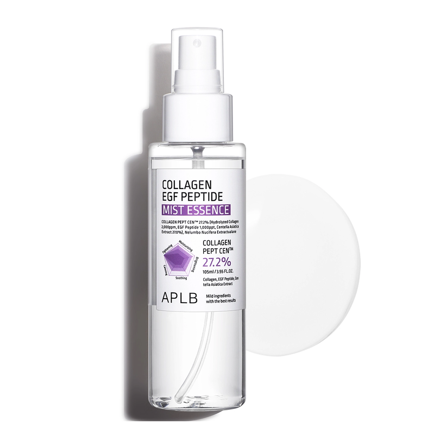 APLB - Collagen EGF Peptide Mist Essence – sejas esence maigas migliņas forma ērtā smidzinātāja iepakojumā. Formula ar patentētu sastāvdaļu Collagen Pept Cen™ satur Āzijas centellas ūdeni, sh-Oligopeptide-1 un hidrolizētu kolagēnu. Šis aktīvo sastāvdaļu komplekss stiprina ādas aizsargbarjeru, veicina atjaunošanos, mitrina un sniedz nomierinošu efektu kairinātai ādai. Pantenols pastiprina produkta pretiekaisuma iedarbību, savukārt skvalāns baro ādu un veicina pārējo sastāvdaļu labāku uzsūkšanos. Esence nesatur papildu smaržvielas, tās pH ir viegli skābs – no 5.0 līdz 6.5.