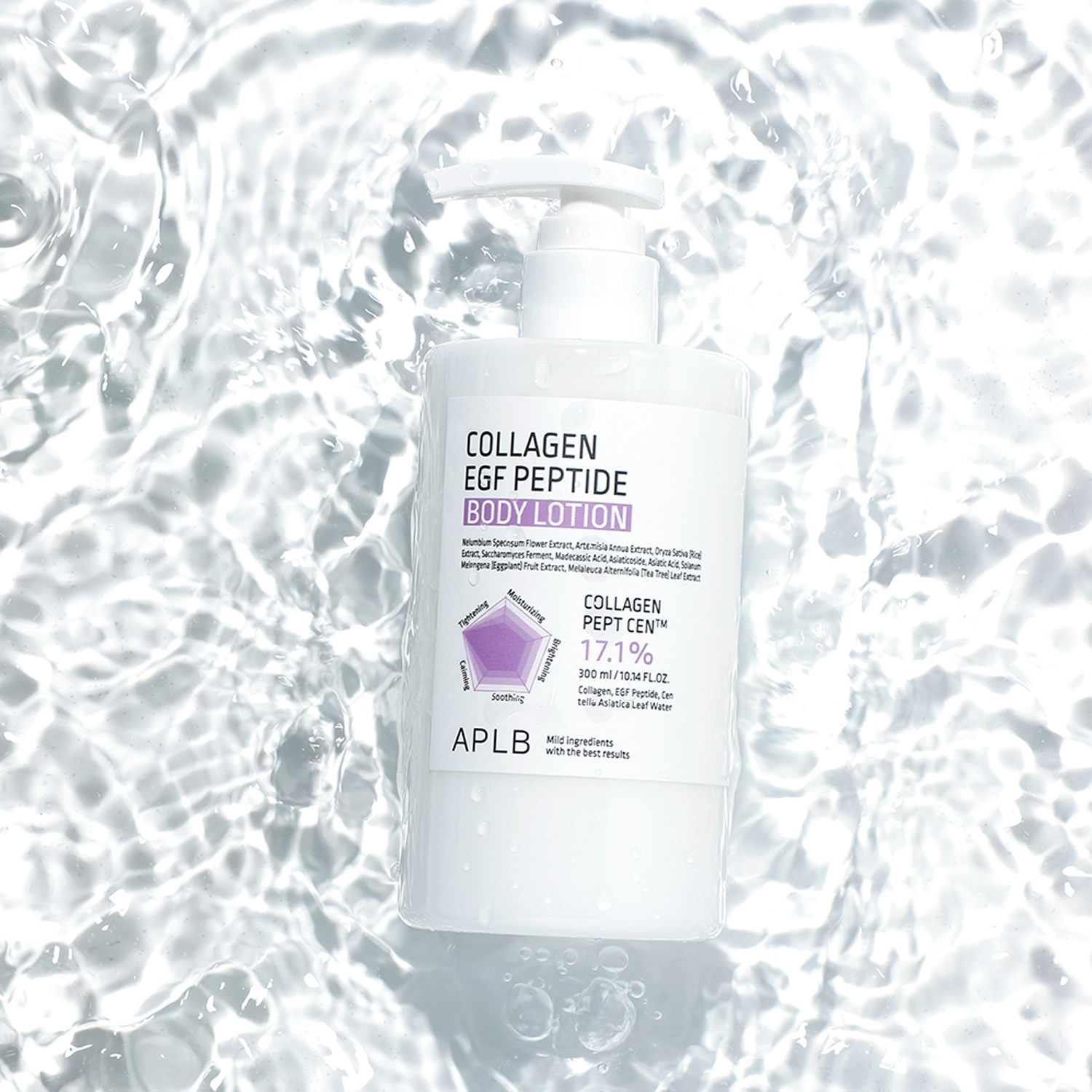 APLB - Collagen EGF Peptide Body Lotion - ķermeņa losjons ar vieglu, barojošu formulu, kas veidots uz Collagen Pept Cen™ kompleksa bāzes – hidrolizēta kolagēna, sh-Oligopeptide-1 un Āzijas centellas aktīvo vielu (aziātskābes, madekasskābes un asiatikozīda) apvienojuma. Šī sastāvdaļu kombinācija nodrošina visaptverošu ādas mitrināšanu, barošanu un atjaunošanu. Hidrolizēts kolagēns veido uz ādas aizsargplēvi, kas palīdz saglabāt mitrumu, bet kopā ar nātrija hialuronātu efektīvi paaugstina mitruma līmeni ādas šūnās. Papildus sastāvā esošais baktēriju ferments stiprina ādas mikrobiomu un epidermas aizsargbarjeru. Regulāra lietošana palīdz nomierināt kairinātu ādu, uzlabot nobriedušas ādas elastību un tvirtumu, kā arī intensīvi mitrināt un barot sausu vai dehidrētu ādu. Losjons nesatur papildu smaržvielas, tāpēc tas ir piemērots arī jutīgas ādas kopšanai.