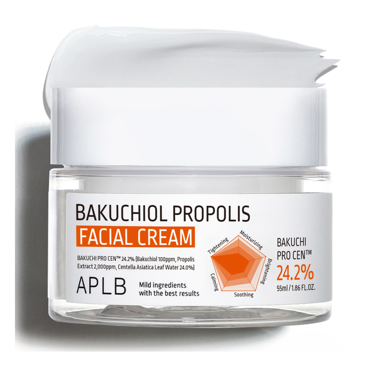 APLB - Bakuchiol Propolis Facial Cream - ikdienas sejas krēms ar pretnovecošanās iedarbību. Sastāvā esošais Āzijas centellas lapu ūdens dziļi mitrina ādu, vienlaikus nomierinot kairinājumu un iekaisumu, atjaunojot ādas komfortu un līdzsvaru. Bakučiols palīdz mazināt grumbas, neitralizē brīvo radikāļu kaitīgo ietekmi un veicina ādas elastību, padarot to gludu un starojošu. Propolisa ekstrakts samazina apsārtumu, savukārt beta glikāns atbalsta ādas atjaunošanās procesus. Formulu papildina trehaloze, kas, pateicoties spējai piesaistīt ūdeni, pastiprina mitrinošo efektu un nodrošina ilgstošu ādas mitrumu.
