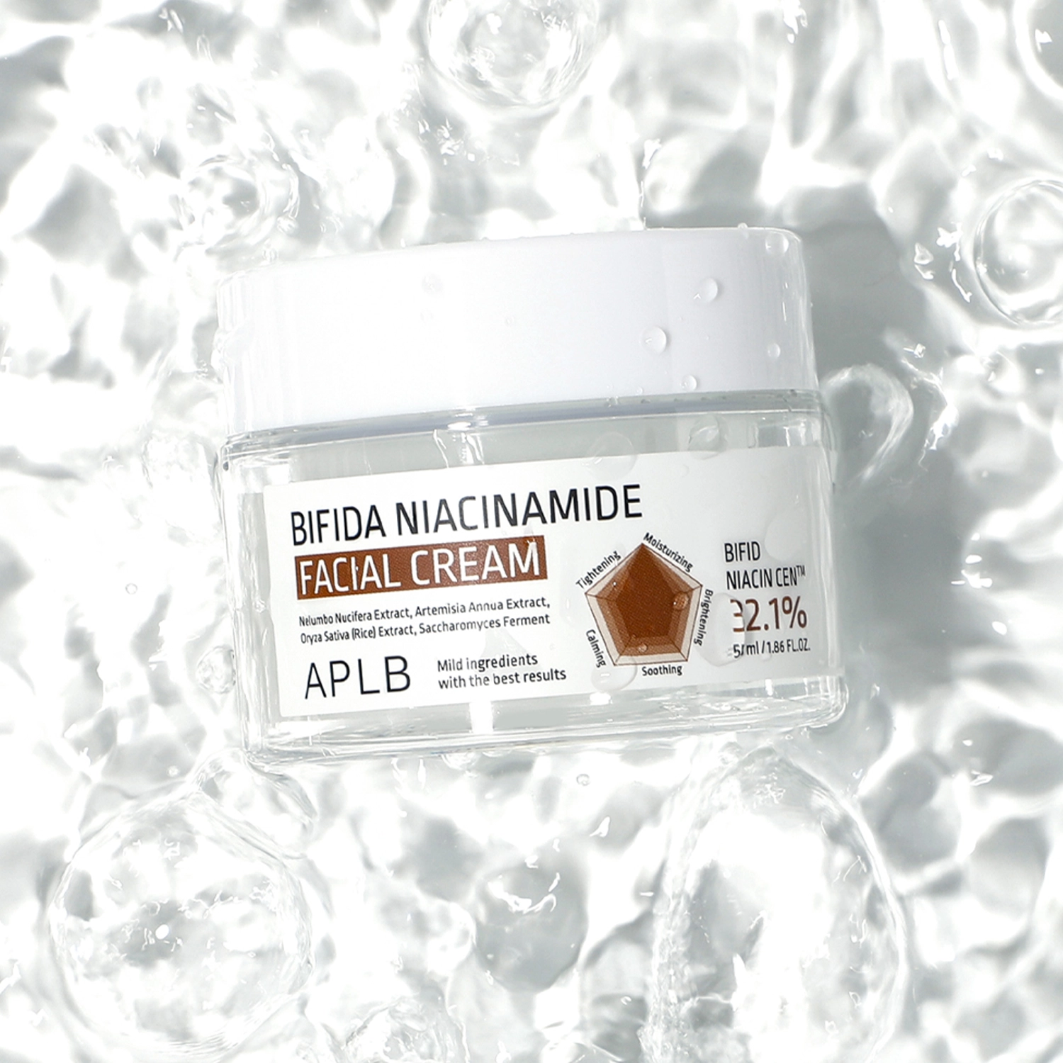 APLB - Bifida Niacinamide Facial Cream - krēms ikdienas sejas kopšanai. Sastāvā esošais Āzijas centellas lapu ūdens intensīvi mitrina ādu, vienlaikus nomierinot kairinājumu un samazinot iekaisumu. Niacinamīds regulē sebuma izdalīšanos un samazina paplašinātu poru redzamību, padarot ādu gludāku, savukārt bifida baktēriju lizāts atjauno ādas mikrobioma līdzsvaru un paātrina tās reģenerāciju. Formula ir papildināta ar nātrija hialuronātu un trehalozi, kas pastiprina mitrinošo iedarbību un padara ādu zīdaini maigu. Krēms ir lielisks papildinājums ikdienas taukainas un jauktas ādas kopšanai, īpaši, ja ir izteikti paplašinātas poras.