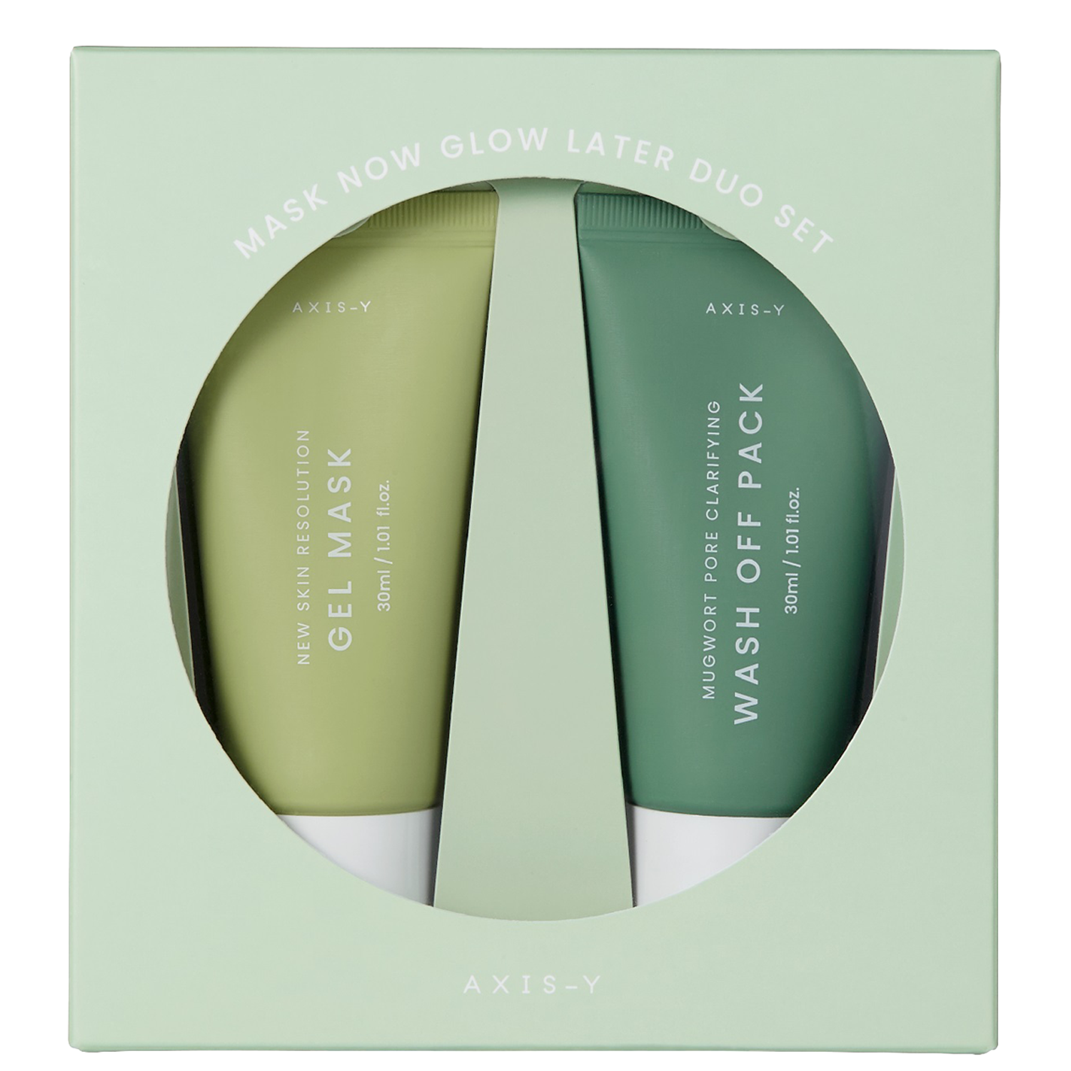 Axis-y - Mask Now Glow Later Duo Set - divu sejas masku komplekts, kas nodrošina attīrošu un atjaunojošu iedarbību. To sastāvos iekļautas rūpīgi atlasītas aktīvās vielas, tostarp Āzijas centellas ekstrakts, vērmeles ekstrakts un hialuronskābe. Maskas ir piemērotas visiem ādas tipiem, arī ādai ar nepilnībām. Komplektā ietilpst: