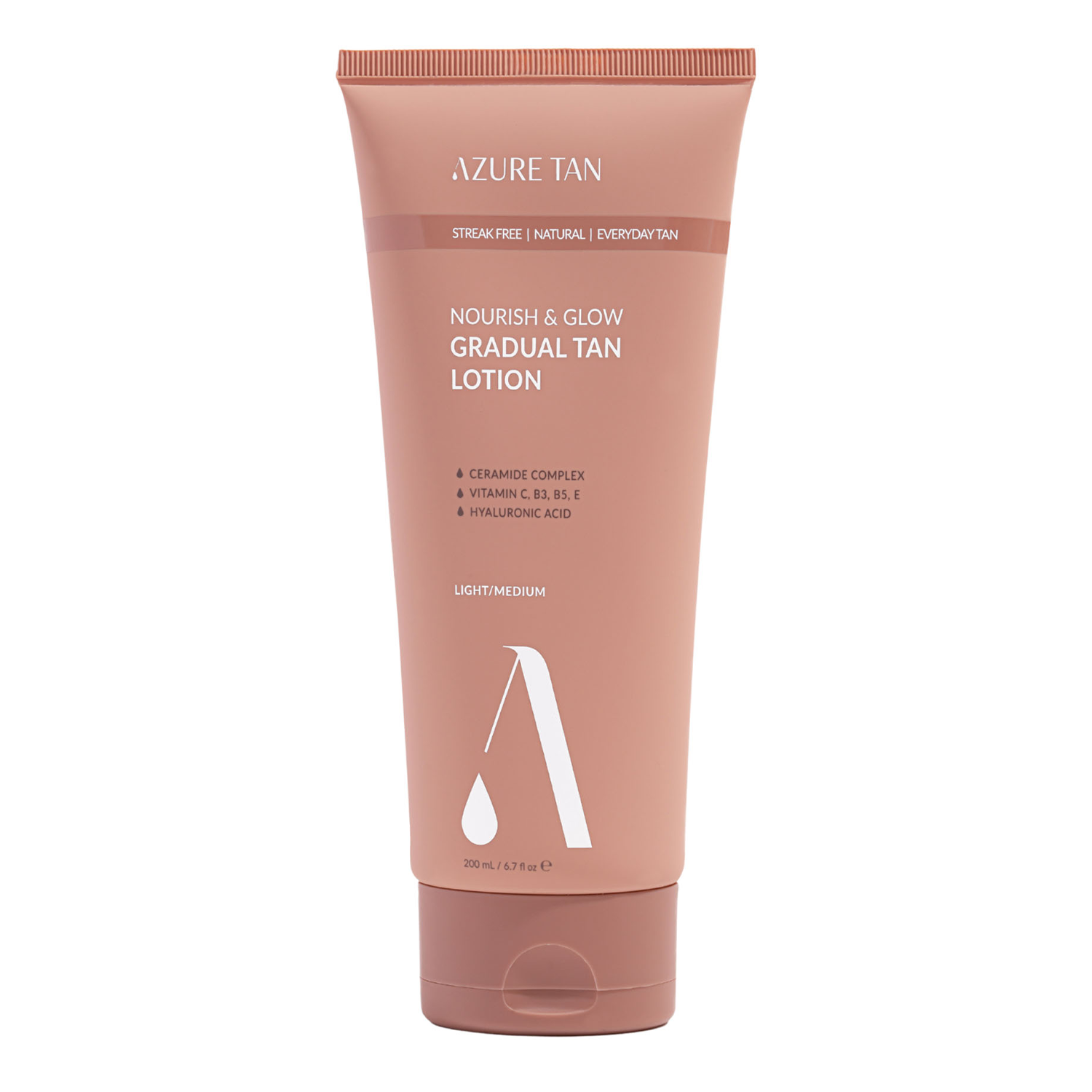 Azure Tan- Nourish & Glow Gradual Tan Lotion - Light/Medium - ķermeņa losjons, kas pakāpeniski iedegina ādu. Keramīdi Satur niacinamīdu, kam piemīt pretiekaisuma un balinoša iedarbība, kā arī samazina tauku dziedzeru sekrēciju. stiprina ādas dabisko aizsargbarjeru un novērš sausumu, atjaunojot mitruma līdzsvaru. Turklāt pantenols nomierina kairinājumu, paātrina ādas reģenerāciju un uztur ādas mitrināšanas līmeni. Jojobas eļļa baro un atdzīvina ādu, piešķirot tai elastību un tvirtumu, savukārt kafijas ekstrakts palīdz mazināt celulītu, vienlaikus darbojoties arī kā dabisks antioksidants un stimulējot asinsriti. Losjons piešķir ādai nesamazinātu iedeguma efektu un redzamu ādas gaišumu. Produkts ir vegānisks.