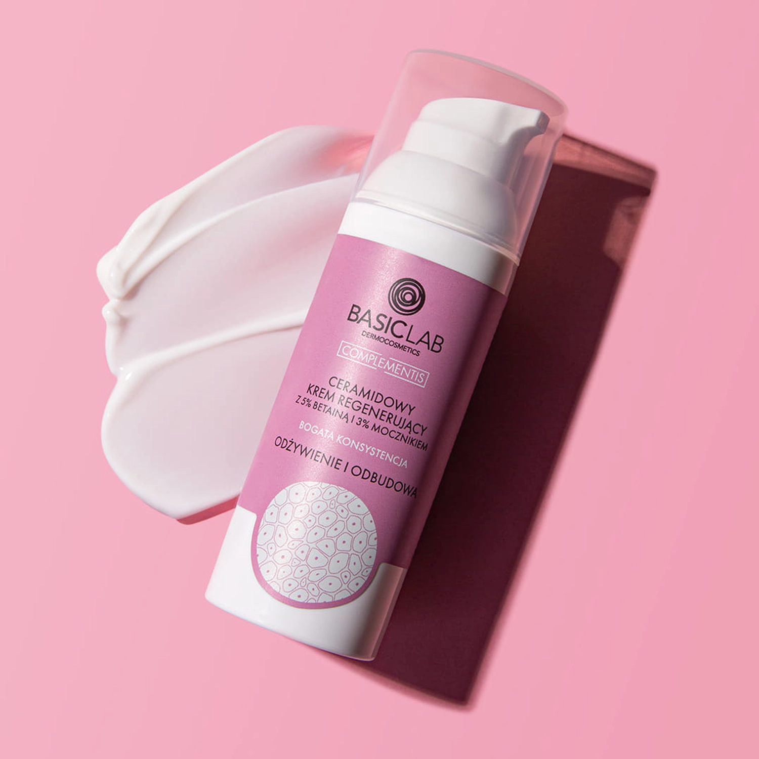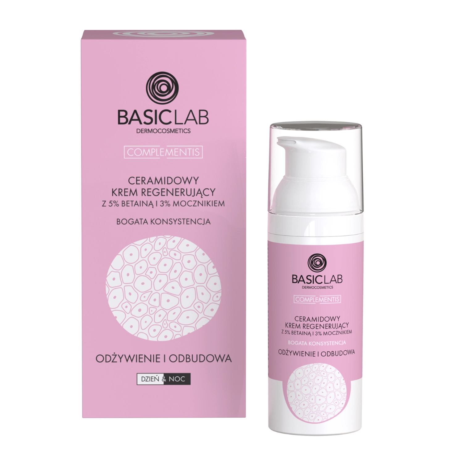 BasicLab - Complementis - Bagātīgas Konsistences Atjaunojošs Keramīdu Krēms ar Betaīnu un Urīnvielu - paredzēts ikdienas lietošanai rīta un vakara ādas kopšanas lakā, rūpējas par pareizu hidrolipīdu barjeras darbību. Dziļi baro un mitrina ādu, pateicoties keramīdiem, kas stiprina ādas barjeru un atjauno. 3 % urīnvielas un 5 % betaīna nodrošina intensīvu barošanu un mitrināšanu. Savukārt fitosfingozīns mazina apsārtumu un nomierina iekaisumu un ādas kairinājumu. Holesterīns stiprina hidrolipīdu barjeru, savukārt trehaloze saista ūdeni ādā, pateicoties kam saglabā tajā mitrināšanu. Šī sviests intensīvi mīkstina un aizsargā ādu no sausuma. Bagātīgā krēma formula veido aizsargslāni uz ādas. To var izmantot sievietes, kas baro bērnu ar krūti un grūtnieces, kā arī bērni no 3 gadu vecuma.