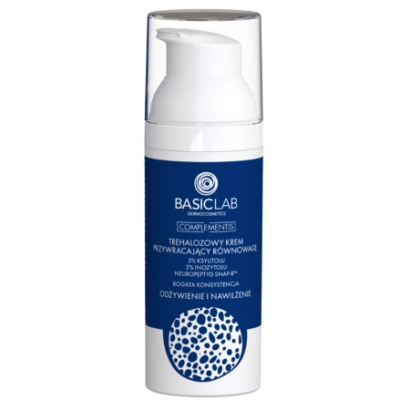 BasicLab - Barošana un mitrināšana - Trehalose Restoring Balance Cream 3% ksilitols, 2% inozitols, SNAP-8™ neiropeptids ar bagātīgu konsistenci - bagātīgas tekstūras sejas krēms, kas nodrošina dziļu barošanu. Tas atjauno, novērš raupjumu un sausumu. Pateicoties trehalozes, inozitola un ksilitola saturam, tas nodrošina ādu ar mitrumu, stiprina epidermu un mazina kairinājumu. Savukārt neiropeptīds SNAP-8™ padara ādu elastīgāku un nostiepj to. Krēms atstāj aizsargslāni, aizsargājot pret sausumu. To var lietot no 3 gadu vecuma, un to ir droši lietot grūtniecības un zīdīšanas laikā. Produkts ir vegānisks un nesatur smaržvielas.