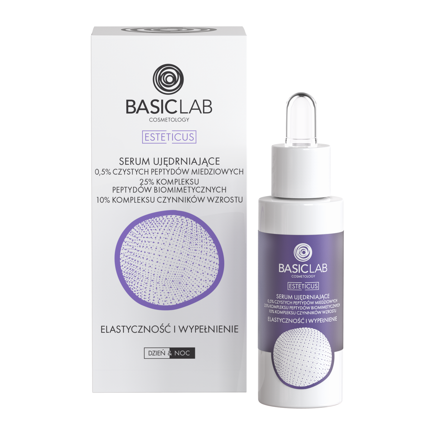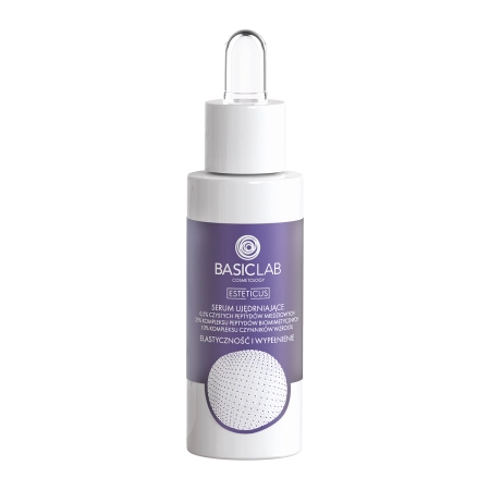 BasicLab - Elasticity and Filling - Firming Serum 0,5% Copper Peptides - nostiprinošs sejas serums. Nodrošina pretgrumbu un savelkošu iedarbību, lai palīdzētu jums baudīt jaunības izskatu. Satur tīrus vara peptīdus (0,5%), kas stimulē kolagēna un elastīna ražošanu. Biomimētiskais peptīdu komplekss (25% ) samazina grumbas un sīkās grumbiņas un novērš jaunu grumbiņu veidošanos. Augšanas faktoru komplekss (10 % ) veicina atjaunošanās procesus un hialuronskābe intensīvi mitrina. Serums nodrošina daudzvirzienu atjaunojošu iedarbību. To var lietot gan dienā, gan naktī. Tam ir zila krāsa, kas ir saistīta ar augstu vara peptīdu koncentrāciju. Tas nesatur pievienotu smaržvielu. Produkts ir dermatoloģiski testēts jutīgai ādai. Tā formula ir vegāniska.