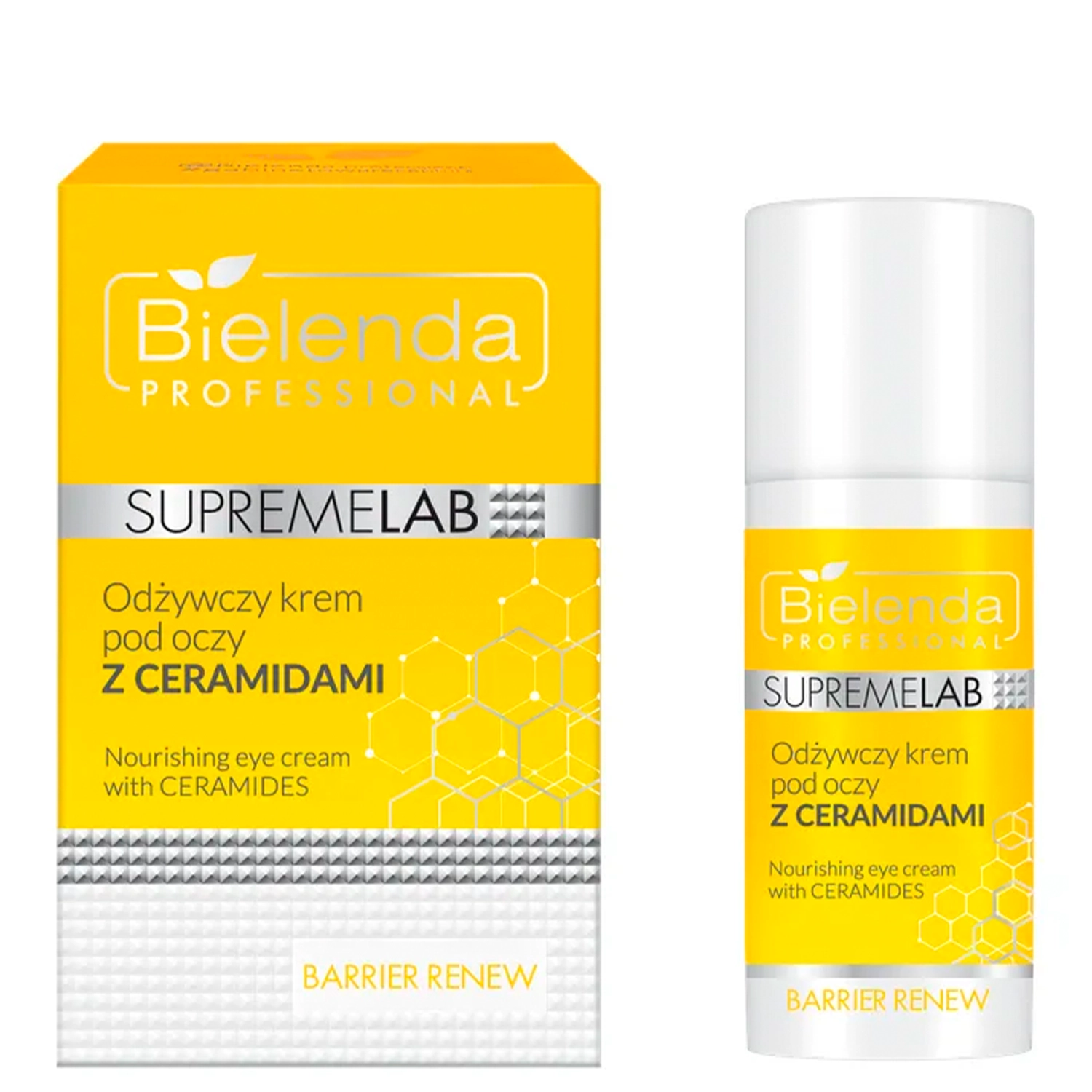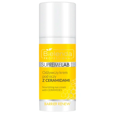 Bielenda Professional - Supremelab Barrier Renew - Barojošs Acu Krēms ar Keramīdiem - barojošs acu krēms ar aktīvo sastāvdaļu bagātu formulu. Tā sastāvā esošais keramīdu komplekss stiprina ādas barjeru, uzlabo tās elastību un mitrina. Skvalāns atjauno lipīdu barjeru un izlīdzina ādas virsmu, fitosfingozīns veicina ādas atjaunošanos, savukārt holesterīns palīdz nostiprināt hidrolipīdu barjeru. Produkts ir ideāli piemērots ādai, kurai nepieciešama reģenerācija, nostiprināšana un intensīva barošana.