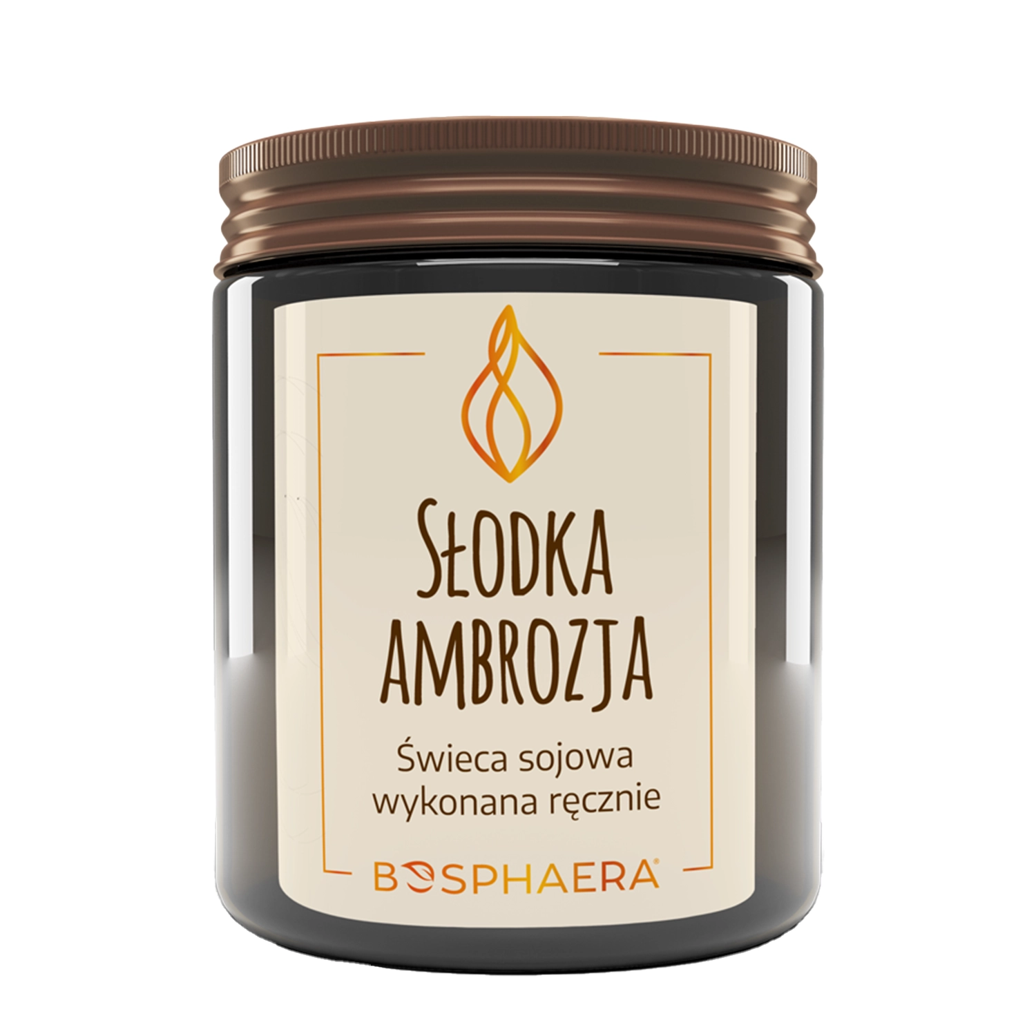 Bosphaera - Sojas Svece - Saldā Ambrozija - svece no 100% dabīga, ekoloģiska sojas vaska. Atšķirībā no parafīna tā deg zemākā temperatūrā un neizdala kaitīgas vielas. Aromātu veido salda aveņu un kazenes smarža, kas ļauj baudīt patīkamu noskaņu vairākas stundas. Svecei ir koka dakts, kas degšanas laikā rada degoša koka sprakšķiem līdzīgu skaņu. Produkts iepildīts tumšā, ekoloģiskā stikla traukā, kuru pēc iztīrīšanas iespējams izmantot atkārtoti.