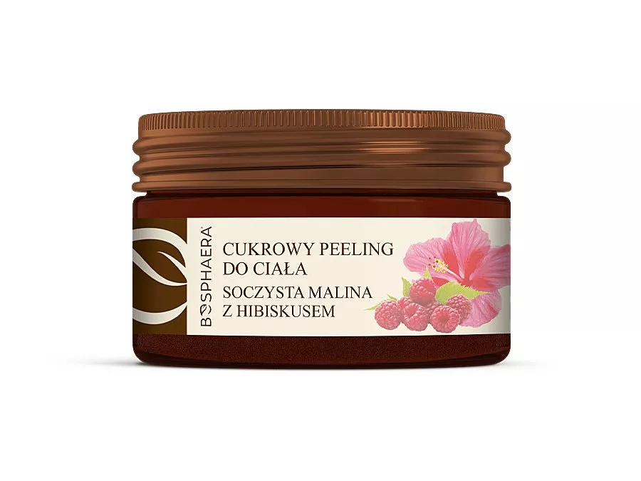Bosphaera - Cukura Pīlings Ķermenim - Sulīgā Avene ar Hibisku - skrubis ar cukura kristāliem, kas noloba atmirušo epidermu, izlīdzina ādas virsmu un stimulē mikrocirkulāciju. Andirobas eļļa novērš ūdens zudumu caur epidermu un nodrošina barojošu efektu, savukārt saldo mandeļu un persiku kauliņu eļļas mīkstina un izlīdzina ādu. Papildus pievienotais E vitamīns neitralizē brīvos radikāļus un veicina ādas atjaunošanos. Produktu bagātina sulīga aveņu un hibiska aromāta kombinācija.