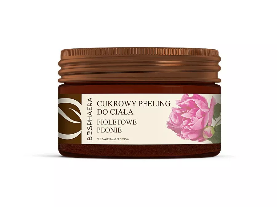 Bosphaera - Cukura Ķermeņa Skrubis - Violetas Peonijas - skrubja sastāvā esošie cukura kristāli noloba atmirušo epidermu, izlīdzina ādas virsmu un stimulē mikrocirkulāciju. Andirobas eļļa novērš ūdens zudumu caur epidermu un veido aizsargkārtu, bet saldo mandeļu un persiku kauliņu eļļas mīkstina un padara ādu gludāku. Papildus E vitamīns neitralizē brīvos radikāļus un atbalsta ādas reģenerācijas procesus. Produktu papildina maigs peoniju aromāts.