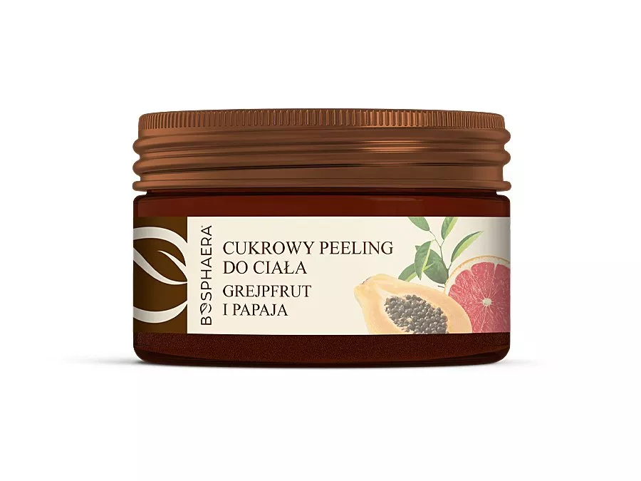 Bosphaera - Cukura Ķermeņa Skrubis - Greipfrūts ar Papaiju - skrubis ar kristāliskām cukura daļiņām efektīvi noloba atmirušo epidermu, izlīdzina ādas virsmu un stimulē mikrocirkulāciju. Andiroba eļļa palīdz novērst ūdens zudumu un nodrošina intensīvu mitrināšanu, savukārt saldo mandeļu eļļa un persiku kauliņu eļļa mīkstina un padara ādu gludāku. Papildus E vitamīns neitralizē brīvos radikāļus un atbalsta ādas dabisko atjaunošanos. Produktu bagātina svaigs greipfrūta un papaijas aromāts.