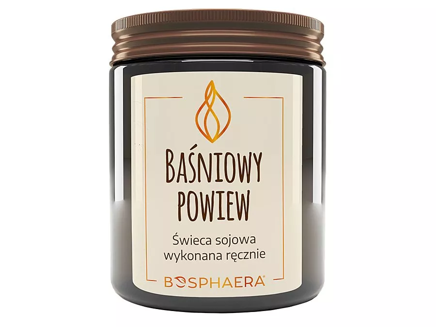Bosphaera - Sojas Svece - Pasaku Vējš - dabiska, videi draudzīga, ar rokām darināta sojas vaska svece ar apelsīnu ziedu aromātu, kas uzmundrina un piešķir enerģiju. Svecei ir koka dakts, kas degot rada patīkamas ugunskura sprakšķēšanai līdzīgas skaņas. Tā iepildīta elegantā, tumša stikla traukā, kuru pēc izlietošanas var viegli iztīrīt un izmantot atkārtoti. Enerģizējošais aromāts ir īpaši piemērots dedzināšanai dienas laikā.