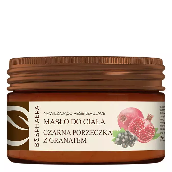 Bosphaera - Mitrinošs un Atjaunojošs Ķermeņa Sviests - Upene ar Granātābolu - ķermeņa sviests, kas mīkstina un dziļi mitrina ādu. Tā sastāvā esošā vīnogu kauliņu eļļa efektīvi baro un izlīdzina ādu, savukārt kakao sviests un saldo mandeļu eļļa veido okluzīvu aizsargslāni, kas pasargā epidermu no ūdens zuduma.