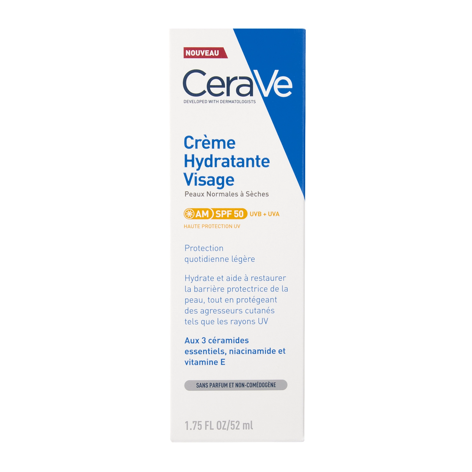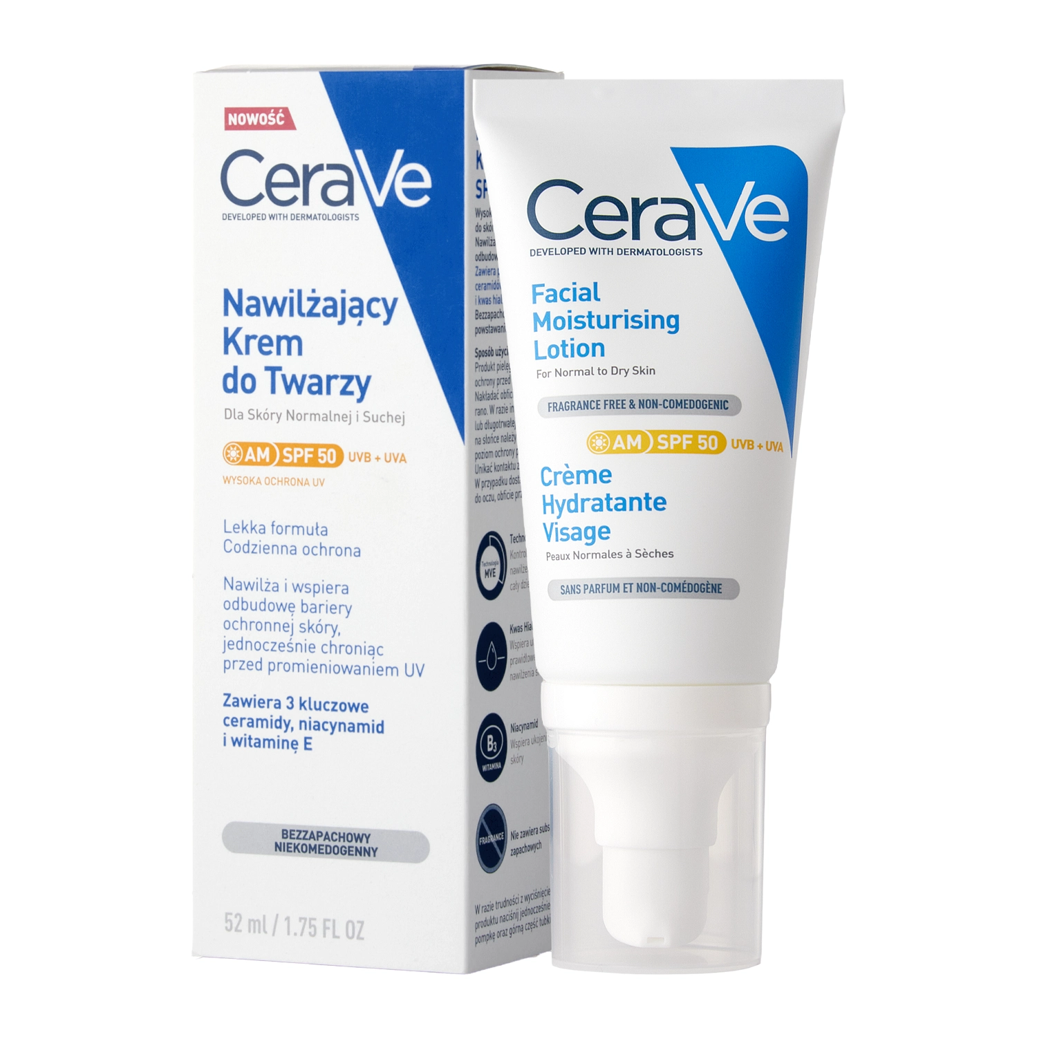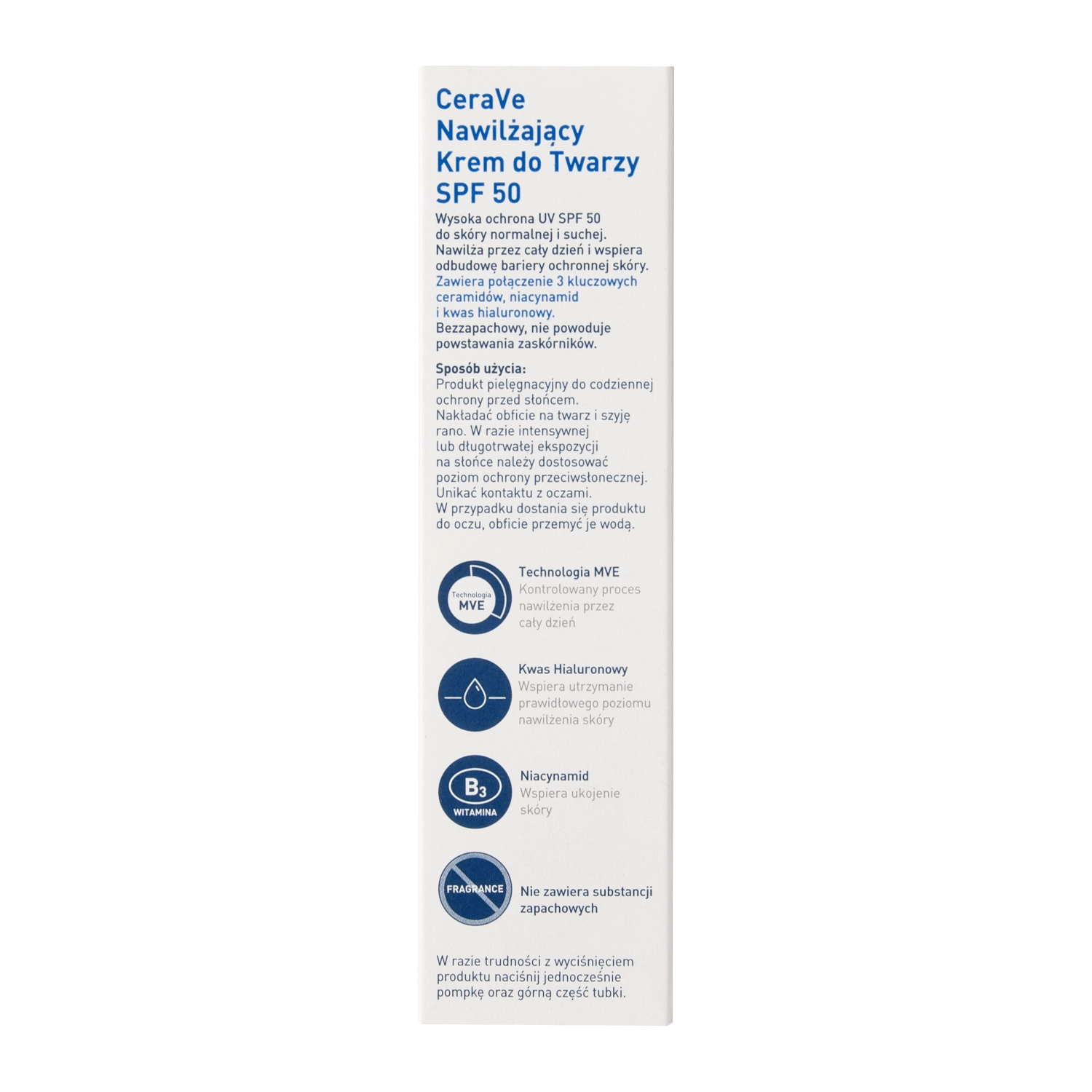 CeraVe - Mitrinošs sejas krēms SPF50 - sejas krēms ar pretsaules aizsardzību visiem ādas tipiem. Tas satur ķīmiskus filtrus, kuri aizsargā ādu no UV starojuma. Krems ir bagātināts ar trīs veidu keramīdiem, kas stiprina ādas hidrolipīdu barjeru un aizsargā to no izžūšanas. Niacinamīds nodrošina antioksidantu un pretiekaisuma iedarbību, pateicoties kam efektīvi mazina ādas apsārtumus un kairinājumu, kā arī regulē tauku dziedzeru darbību un izlīdzina ādas toni. Papildus tam holesterīns mīkstina, izlīdzina un nostiprina epidermu, savukārt nātrija hialuronāts spēcīgi mitrina. Krēms aizsargā ādu no UV starojuma negatīvās ietekmes, papildus to mitrinot un nomierinot. Krēms ir bez smaržas.