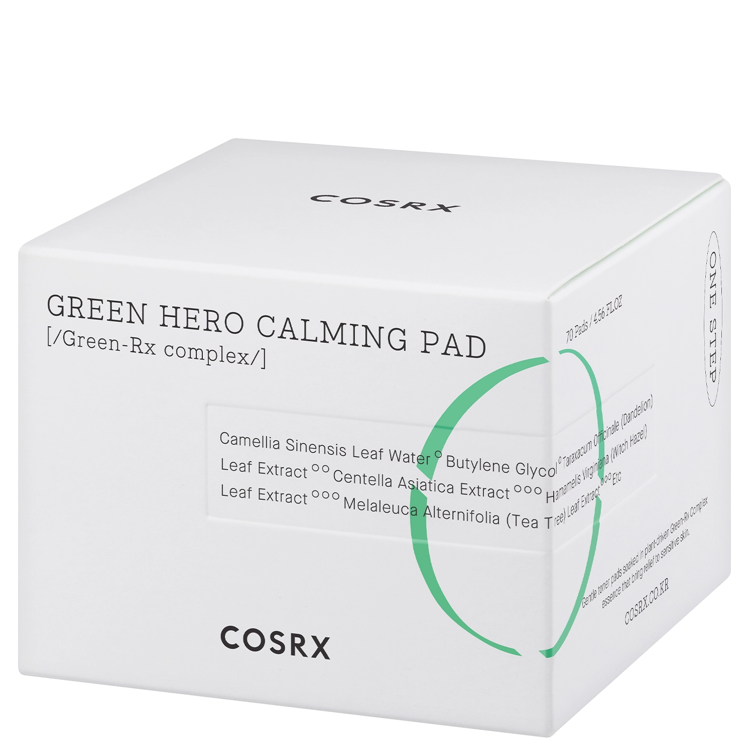 Cosrx - One Step Green Hero nomierinošs spilventiņš - sejas spilventiņi uz pretiekaisuma un nomierinoša zaļās tējas hidroāta bāzes. Formulas sastāvā ir augu izcelsmes Green-Rx komplekss, kas ietver pieneņu ekstraktu, centellas asiatiskās ekstraktu un vīgriezes hidrolātu, kas atjauno ādu, nomierina un mazina kairinājumu, kā arī nodrošina antioksidantu aizsardzību. Tamponi ir bagātināti ar laktobionskābi, kam piemīt mitrinošas, mīkstinošas, izlīdzinošas un nomierinošas īpašības. Sastāvā esošo vielu dēļ spilventiņi ir ideāli piemēroti jutīgas, problemātiskas un uz pinnēm tendētas ādas kopšanai, kurai nepieciešama nomierināšana, nomierināšana un reģenerācija. Katrs spilventiņš sastāv no divām daļām: izliektā puse izlīdzina, bet gludā puse mitrina.
