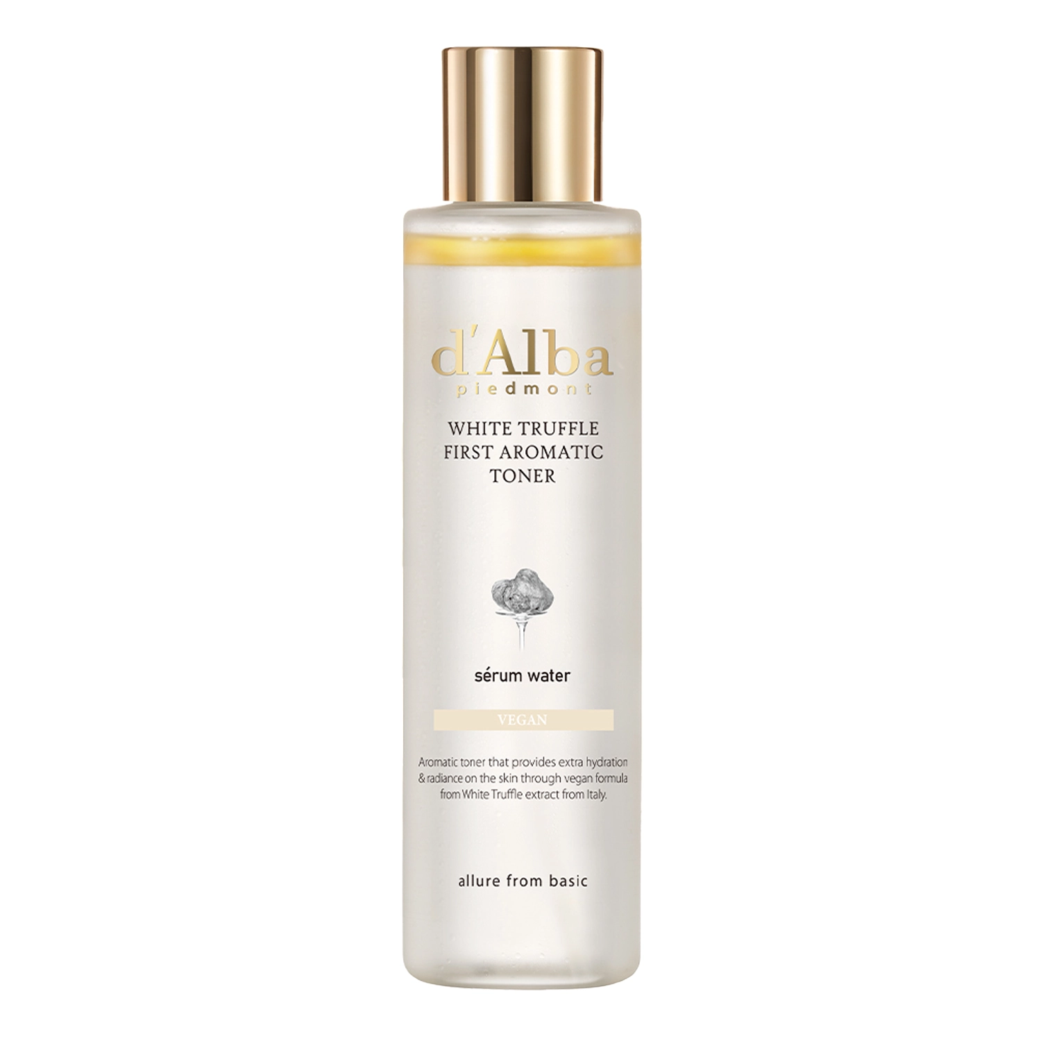 d'Alba - White Truffle First Aromatic Toner - divfāžu atjaunojošs toniks, ieteicams visiem ādas tipiem. Sastāvs satur balto trifeļu ekstraktu ar aizsargājošām, barojošām un pretgrumbu īpašībām. Kosmētikas līdzekļa eļļas formulas pamatā ir avokado eļļa, kas atjauno un padara ādu elastīgāku. Savukārt ūdens daļa satur gotu kolas ekstraktu un zaļās tējas ekstraktu, kam piemīt antioksidanta, pretiekaisuma un antibakteriālas īpašības. Sastāvu papildina glikoonolaktons, bromelaīns un papaīns - sastāvdaļas, kas pīlingo un izlīdzina ādu. Toniks padara ādu mitrinātu, barotu un gludu. Produkts ir vegāns.