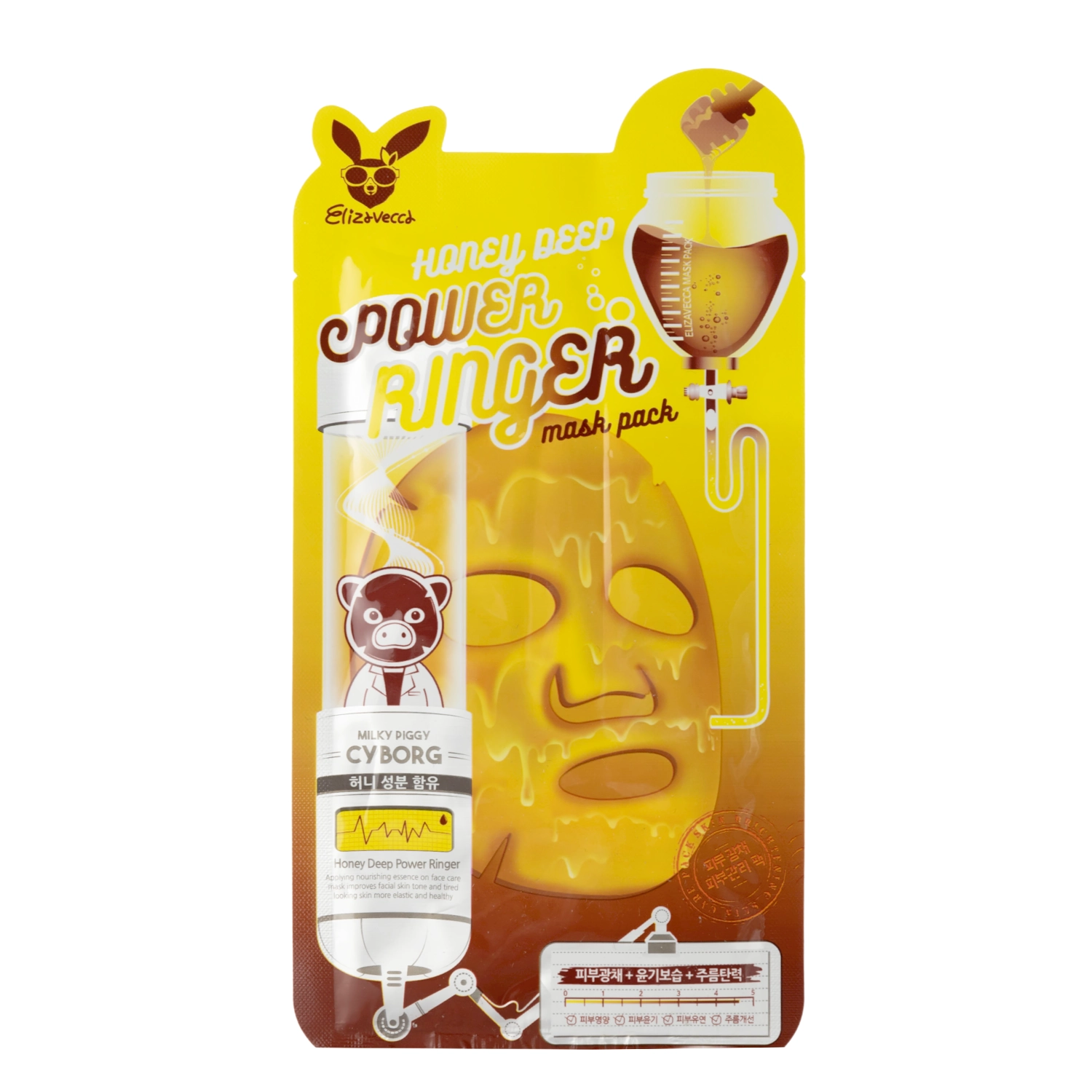 Elizavecca - Honey Deep Power Ringer Mask Pack - sejas maska ar liftinga un elastību uzlabojošu iedarbību. Tās sastāvā ir spēcīgi mitrinoša hialuronskābe un gliemežu gļotu ekstrakts, atjaunojošs medus ekstrakts un antioksidējošs Virdžinijas burvju lazdas ekstrakts. Formulu papildina hidrolizēts kolagēns, kas padara ādu patīkami maigu un gludu pieskārienam.