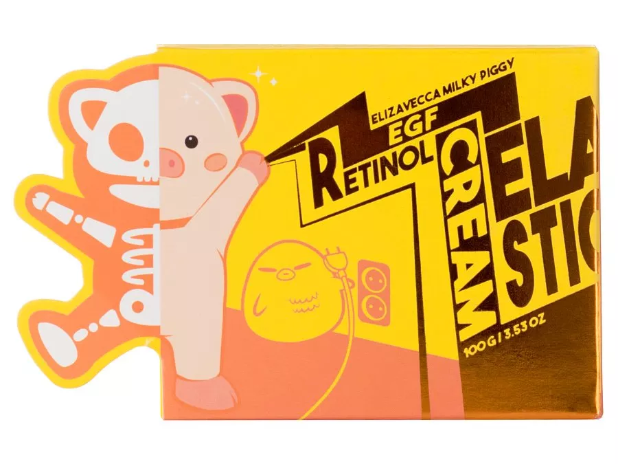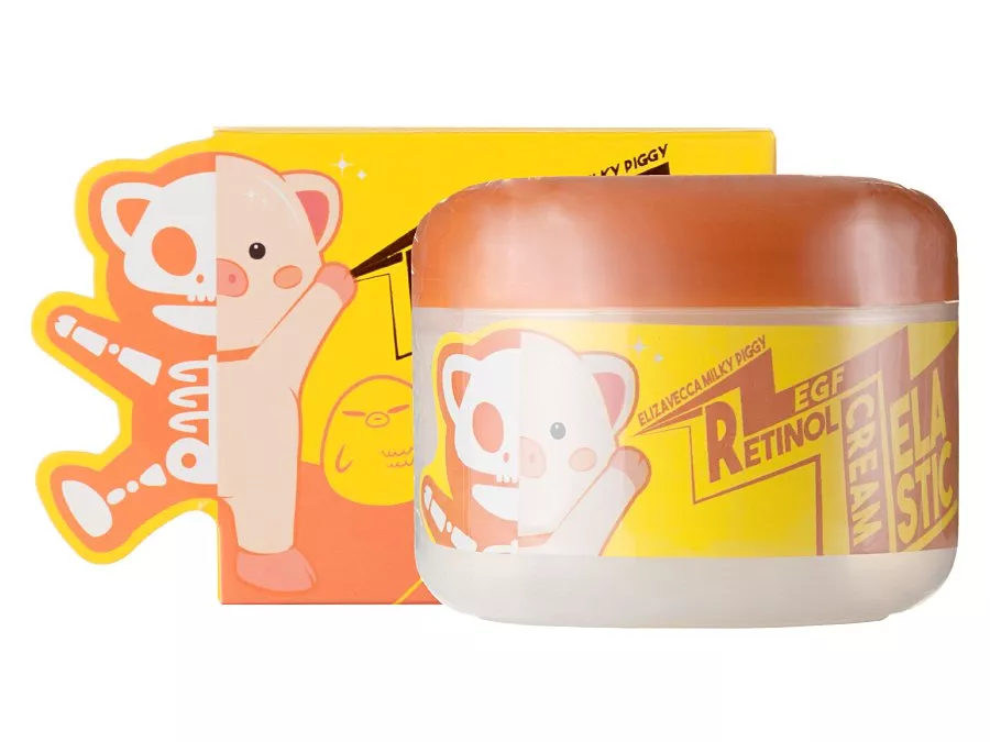 Elizavecca - Milky Piggy EGF Elastic Retinol Cream - krēms ar swiftlet ligzdu ekstraktu un A vitamīnu retinola formā. Abas aktīvās vielas iedarbojas pret novecošanās pazīmēm, izgaismo ādu un izlīdzina tās nelīdzenumus. Retinols vienlaikus ir arī spēcīgs antioksidants. Par ādas mitrināšanu un aizsardzību rūpējas makadāmijas eļļa, savukārt niacinamīds palīdz samazināt sebuma pārmērīgu izdalīšanos un nomierina iekaisumu. Krēms apvieno seboregulējošu, mitrinošu un barojošu darbību, efektīvi samazinot novecošanās pazīmes un pigmentāciju.