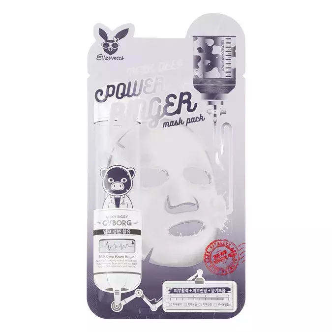 Elizavecca - Milk Deep Power Ringer Mask - maska sausai un nobriedušai ādai. Tajā esošais piena ekstrakts efektīvi atjauno ādu, hialuronskābe un hidrolizēts kolagēns mazina grumbas un intensīvi mitrina, savukārt Virdžinijas burvju lazdas ekstrakta piedeva nodrošina pretiekaisuma iedarbību.