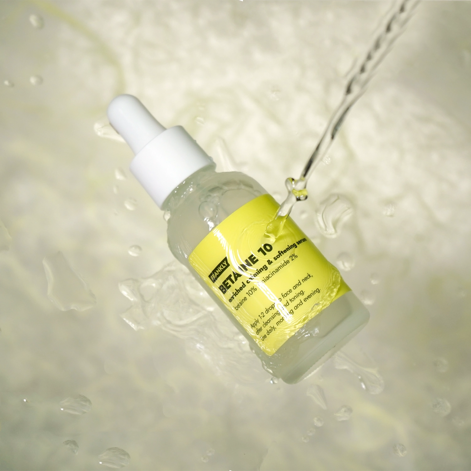 Frankly - Betaine 10% Serum - mitrinoši-mierinošs sejas serums. Satur bagātīgu aktīvo sastāvdaļu sastāvu, kas stiprina hidrolipīdu barjeru un efektīvi nomierina. Betaīns (10%) un pantenols nomierina kairinājumus, kā arī uzlabo epidermas elastību. Niacinamīds (2%) samazina apsārtumus un stimulē keramīdu veidošanos, trehaloze stiprina aizsargbarjeru, savukārt hialuronskābe mitrina un aizsargā pret sausumu. Produkts ir ieteicams dehidrētai ādai ar traucētu hidrolipīdu barjeru, ar noslieci uz kairinājumiem.