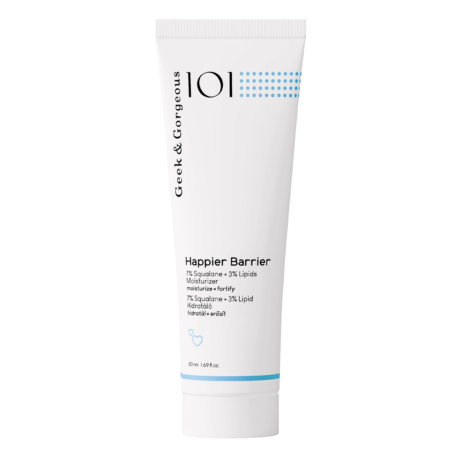 Geek&Gorgeous - Happier Barrier - krēms ādas kopšanai, kurai ir nepieciešama atjaunošana un mitrināšana. Tas satur skvalānu un keramīdu NG, kas atjauno ādas hidrolipīdu barjeru, palielinot tās izturību pret ārējiem faktoriem. Zaļās tējas lapu ekstrakts atbild par apsārtuma un kairinājuma mazināšanu, kā arī antioksidantu aizsardzību. Alantoīna pievienošana atjauno ādu un darbojas pret iekaisumu. Līdzeklis ir ar vieglu un tajā pašā laikā barojošu formulu, atstāj ādu patīkami mīkstu un gludu pieskārienam, kā arī ir piemērots vegāniem.