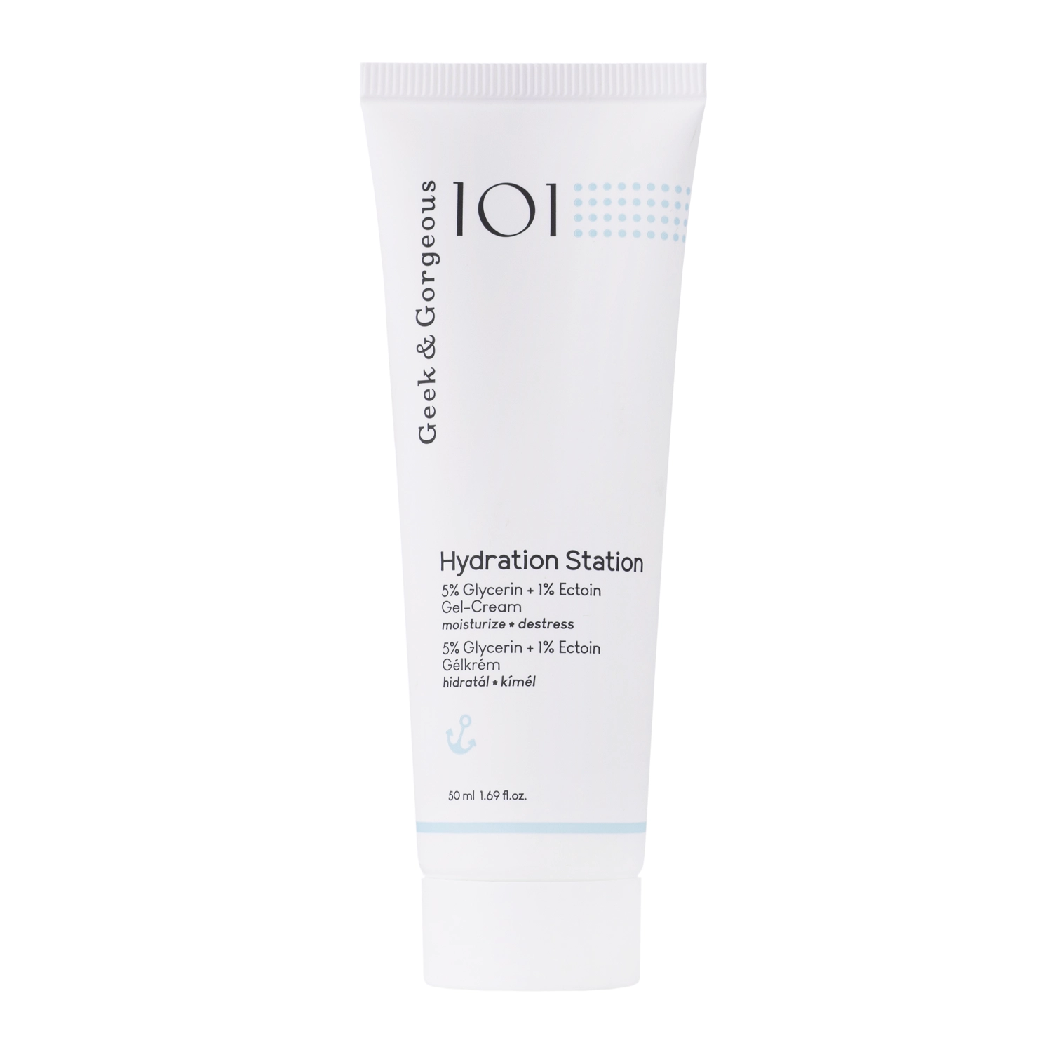 Geek&Gorgeous - Hydration Station - krēms-gels ar vieglu, ātri uzsūcošos tekstūru. Tā sastāvā ir ektoīns, kas spēcīgi mitrina ādu un stiprina tās aizsargbarjeru, kā arī kairinājumu nomierinošs bisabolols un alantoīns. Turklāt E vitamīns aizsargā ādu pret brīvo radikāļu kaitīgo iedarbību un priekšlaicīgu novecošanos. Produkts būs ideāli piemērots uzklāšanai zem kosmētikas, kā arī ir piemērots vegāniem.