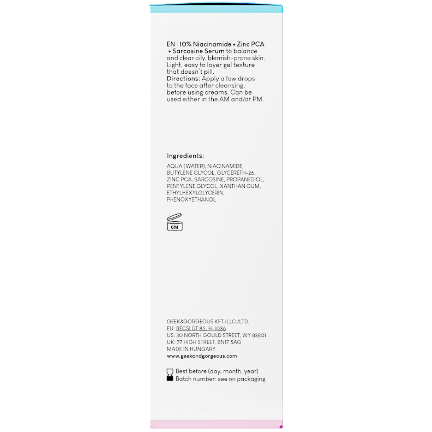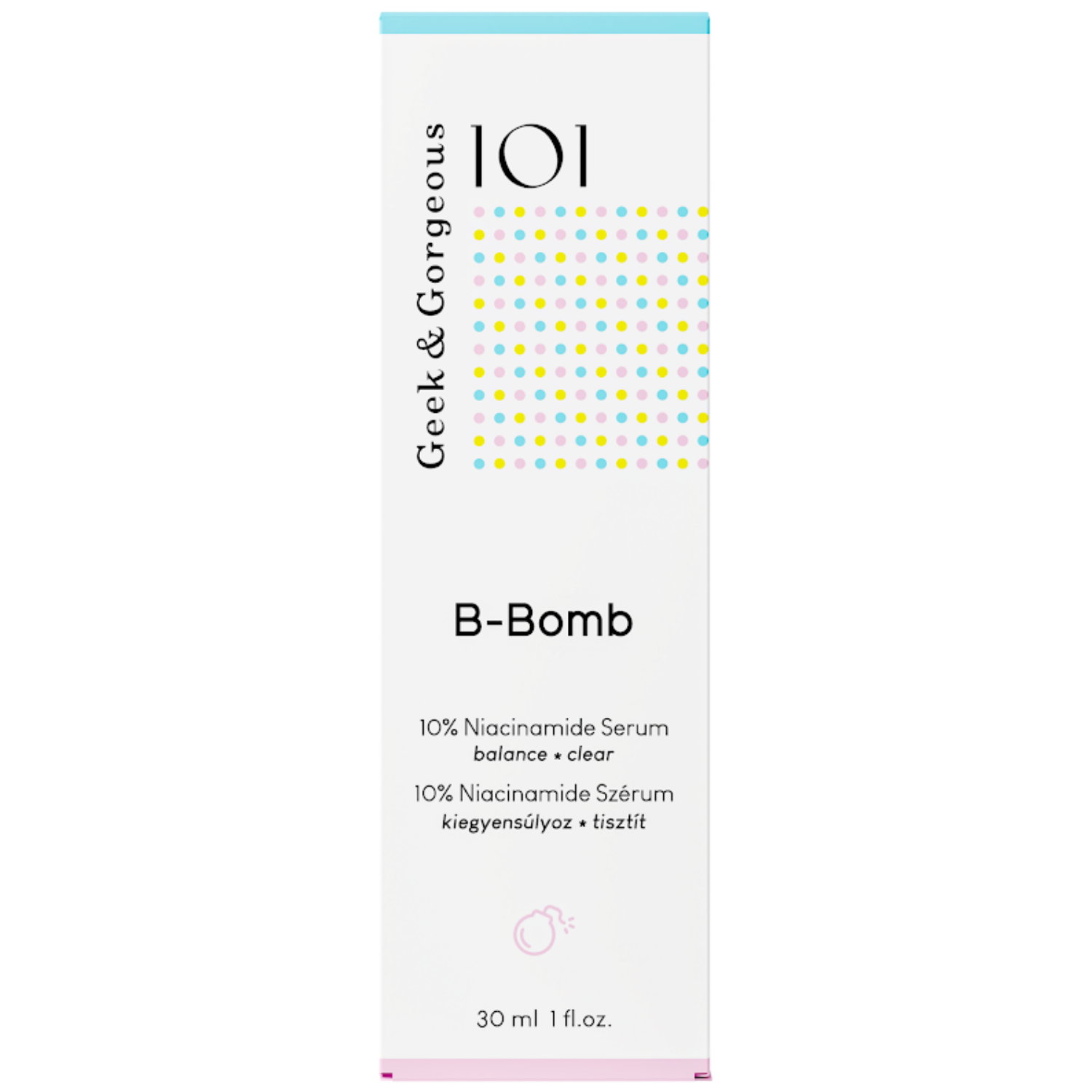 Geek & Gorgeous - B-Bomb - satur niacinamīdu, kam piemīt normalizējoša, pretiekaisuma, pret radikāļu, stiprinoša un izgaismojoša iedarbība. Papildus tam cinka PCA piemīt antibakteriālas, mitrinošas un atjaunojošas īpašības, savukārt sarkozīns samazina tauku dziedzeru izvadu redzamību un regulē to darbību. Serumam piemīt želejveida konsistence, un tas neizraisa ādas sausumu vai savilkšanu. Tā pH ir 5,5-6,5. Kosmētikas līdzeklis ir vegānisks.