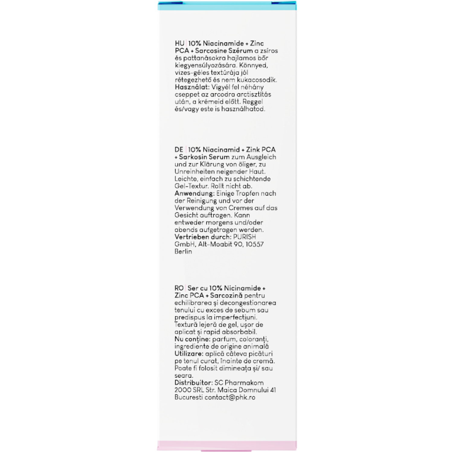 - niacinamīds 10% - stiprina ādas aizsargbarjeru, regulē sebuma izdalīšanos, ta piemīt antioksidanta, pretiekaisuma un izgaismojoša iedarbību, samazina tauku dziedzeru izvadus,