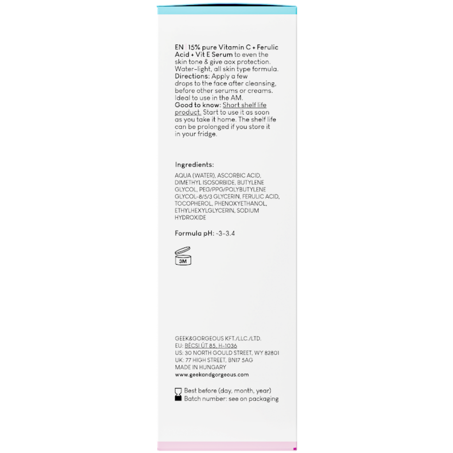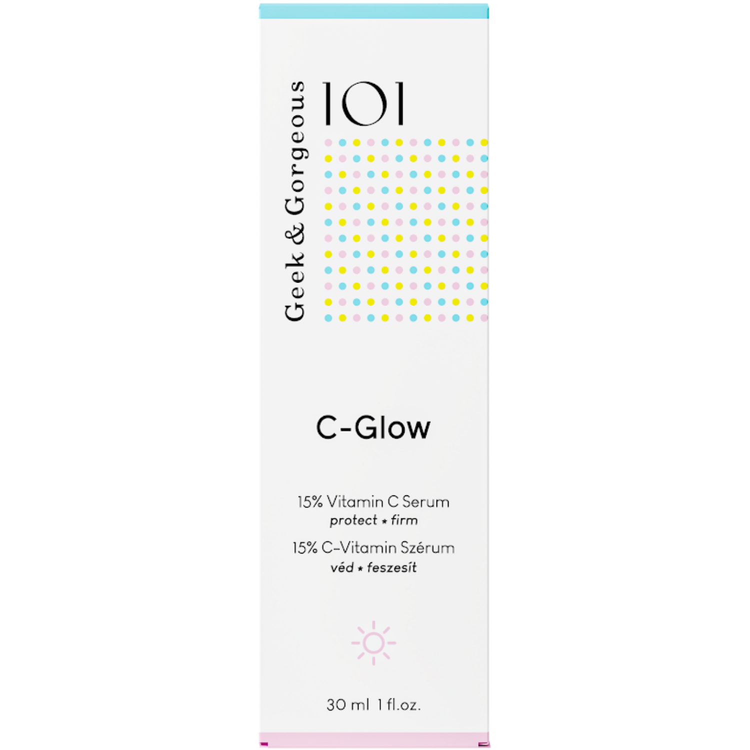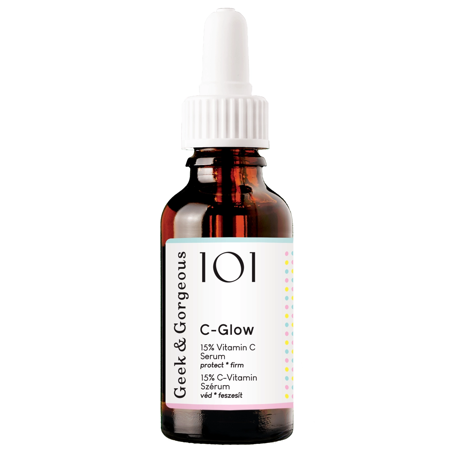 Geek & Gorgeous - C-Glow - pretgrumbu serums, kas satur trīs sastāvdaļas ar spēcīgu antioksidantu iedarbību. C vitamīns 15% koncentrācijā ne tikai cīnās pret brīvajiem radikāļiem, bet arī ietekmē kolagēna sintēzi, kavējot ādas novecošanās procesus, un izlīdzina ādas toni, mazinot pigmentācijas plankumus. Serums ir bagātināts ar ferulīnskābi un E vitamīnu, kas arī ir antioksidanti un ietekmē C vitamīna stabilitāti un atbalsta tā darbību. Serumam piemīt viegla, ūdens formula, un tas ātri uzsūcas. Tā pH ir 3,2-3,4. Tas ir piemērots visiem ādas tipiem, kam nepieciešama antioksidācija un ādas toņa izlīdzināšana, izņemot jutīgu ādu, uz kuru askorbīnskābes koncentrācija un produkta zemais pH var iedarboties kairinoši. Kosmētiskas līdzeklis ir vegānisks.