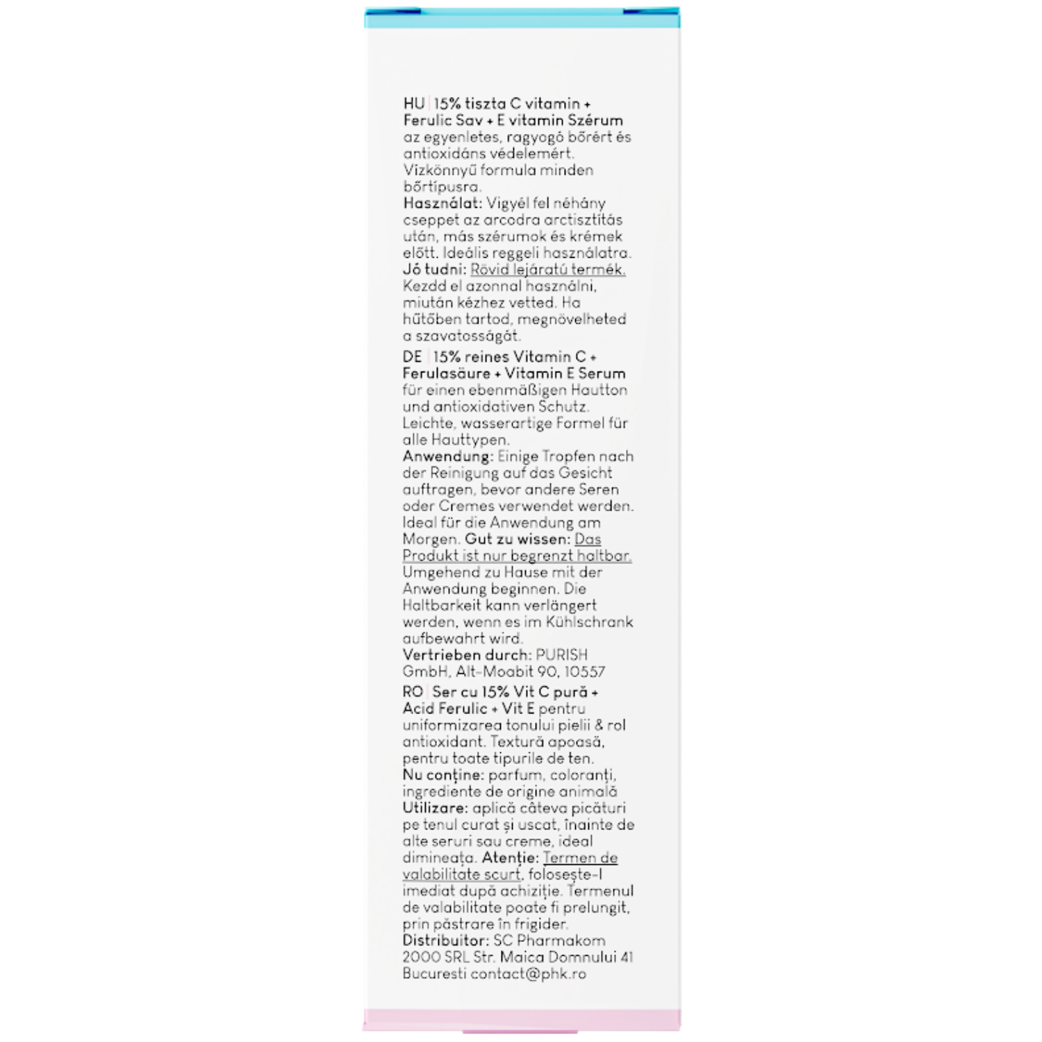 - C vitamīns 15% (L-askorbīnskābes veidā) - antioksidanta un pretnovecošanās iedarbība, tas izgaismo un izlīdzina ādas toni, stiprina asinsvadu sieniņas, atbalsta kolagēna veidošanos,