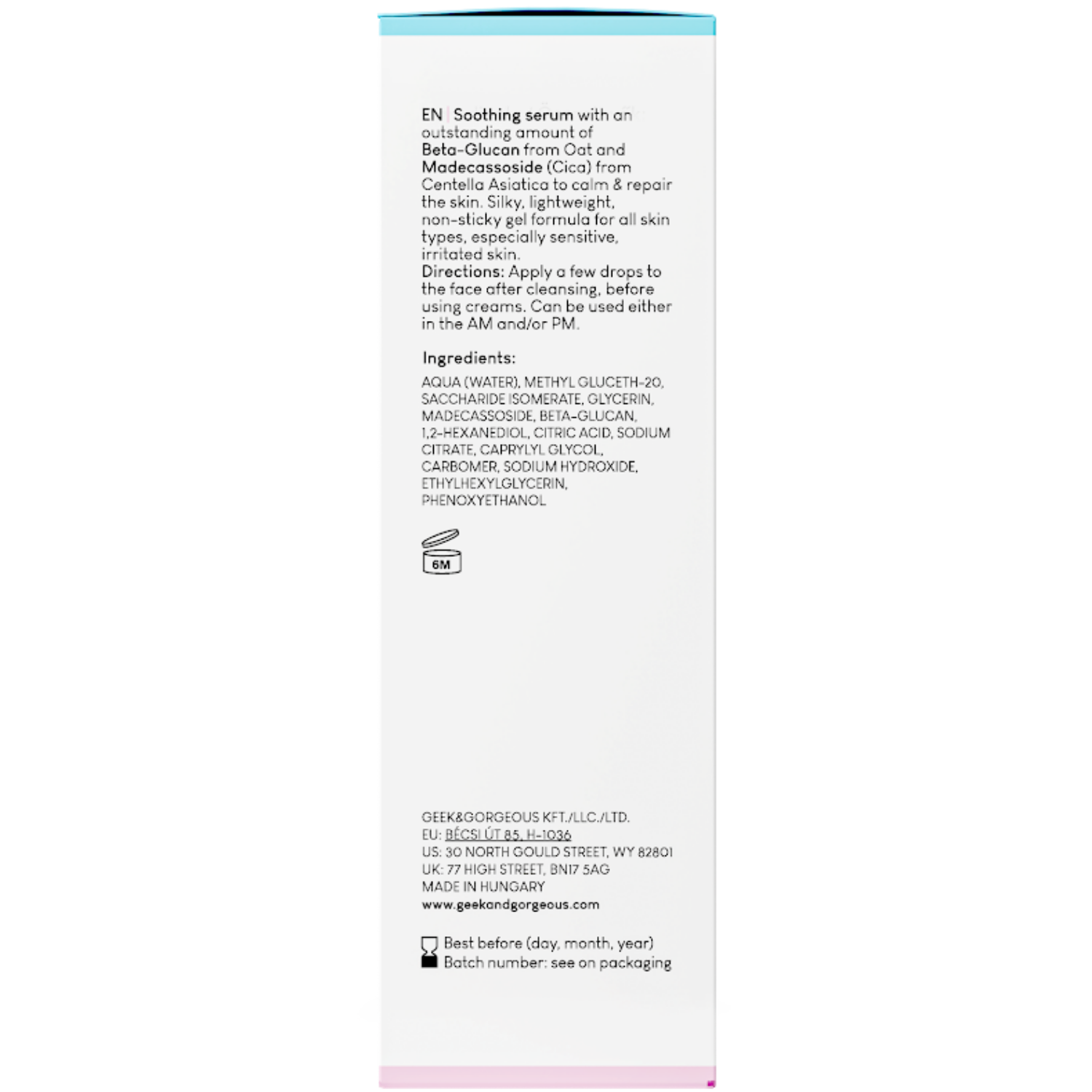 Geek & Gorgeous - Stress Less Beta Glucan + Madecassoside - 0.5% - gēla serums ar beta-glukānu un madekasozīdu ir ideāls līdzeklis ādas hidrolipīdu barjeras atjaunošanai. Beta-glukānam piemīt spēcīga barojoša un atjaunojoša iedarbība, tas gan dziļi mitrina, gan veido slāni uz ādas virsmas, lai novērstu tās dehidratāciju. Madekasozīdam, kas ir iegūts no Āzijas centellas, ir raksturīga spēcīga atjuanojoša, nomierinoša un pretiekaisuma iedarbība. Papildus tam tas regulē melanīna veidošanos, un tam piemīt antioksidanta iedarbība. Kosmētika ir vegāniska.