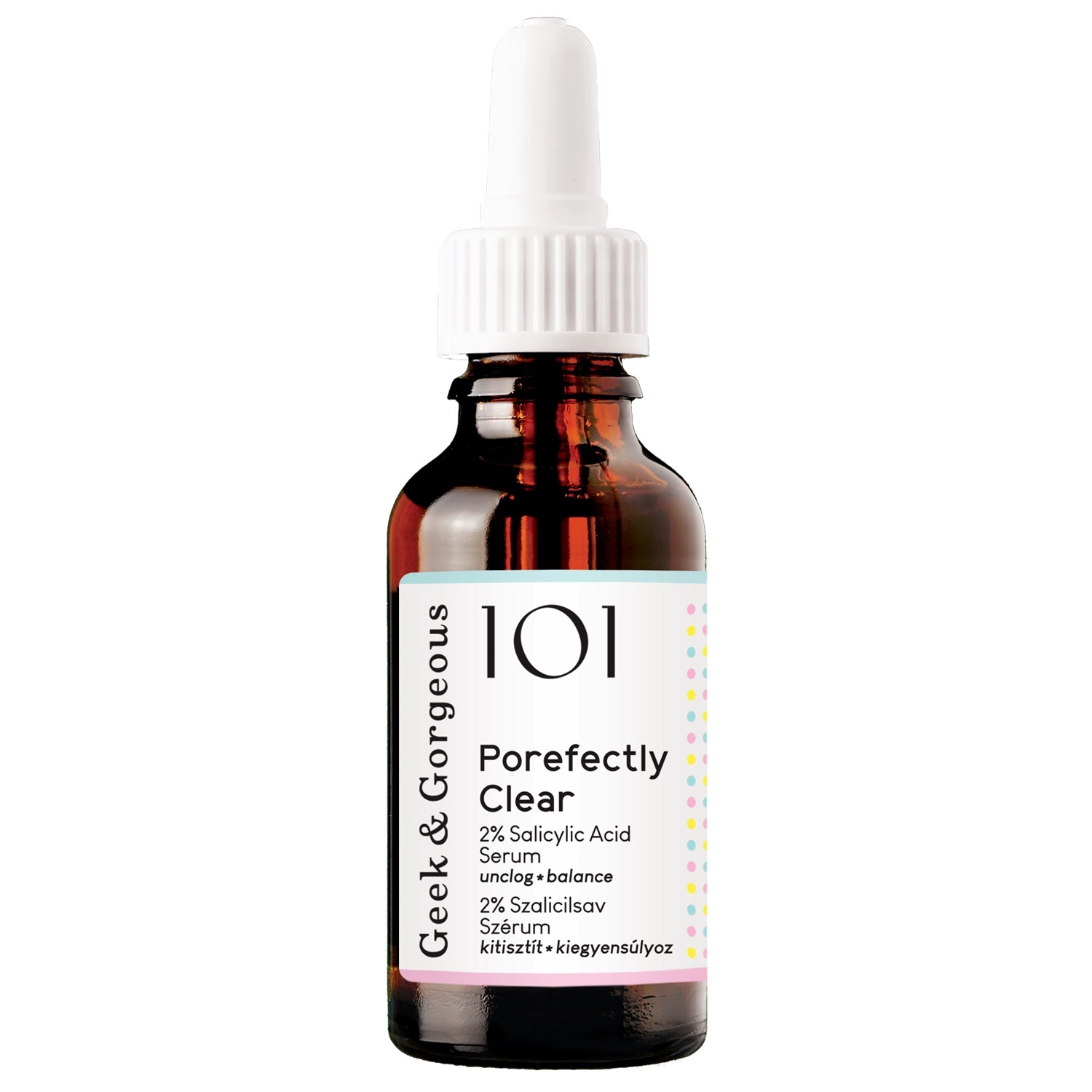 Geek & Gorgeous - Porefectly Clear - serums ar vieglu, želejveida konsistenci. Satur 2% salicilskābi ar pretiekaisuma un tauku dziedzeru izvadu attīrošu iedarbību. Tas palīdz cīņā ar ādas nepilnībām. Turklāt sastāvā esošais sarkozīns regulē sebuma izdalīšanos, un tam piemīt pretgrumbu iedarbība. Alantoīnam ir nomierinošas un kairinājumu mazinošas īpašības. Kosmētikas līdzekļa pH svārstās satp 3,5 līdz 3,9, un tā formula ir vegāniska.