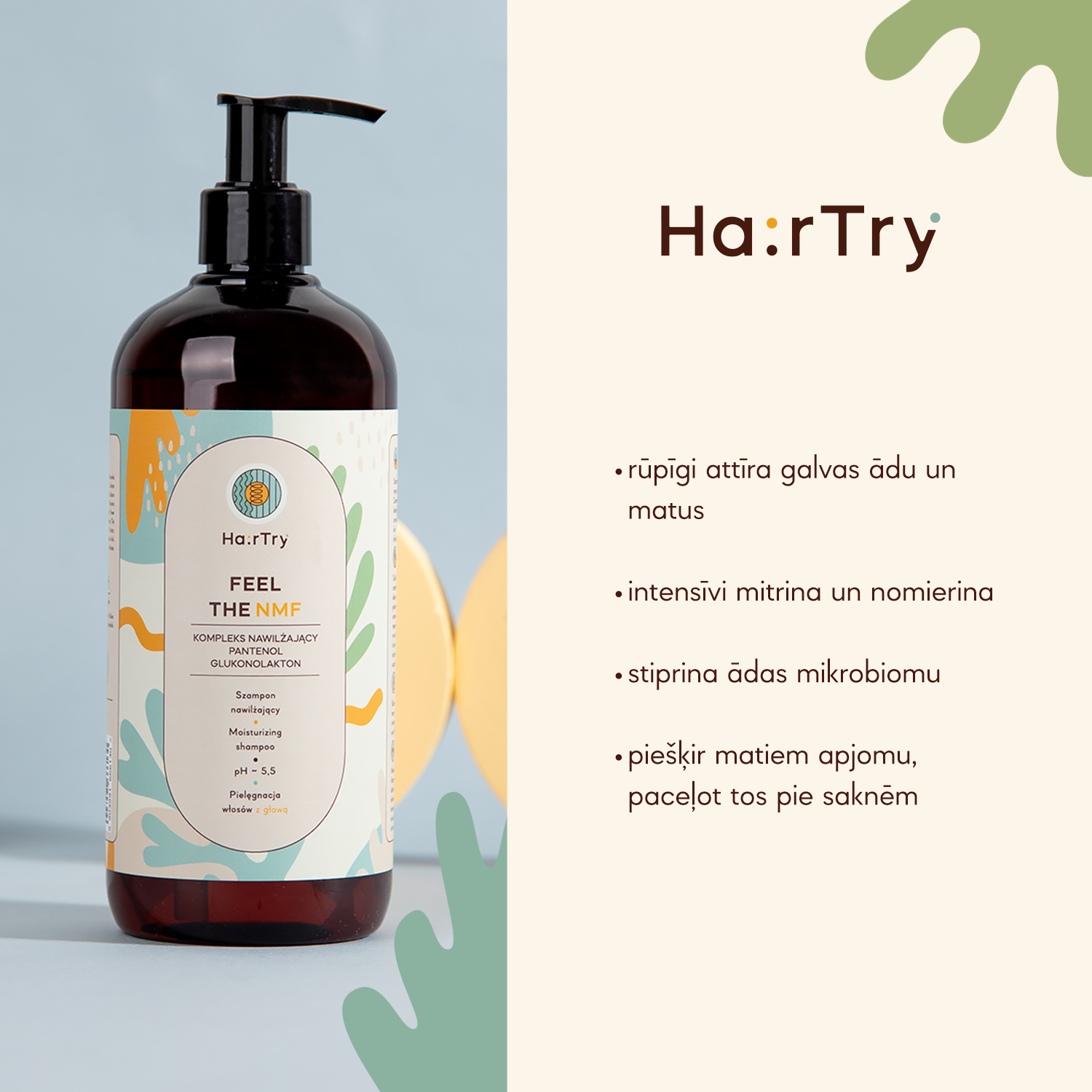 - Mitrinošs šampūns galvas ādas mikrobioma atbalstam