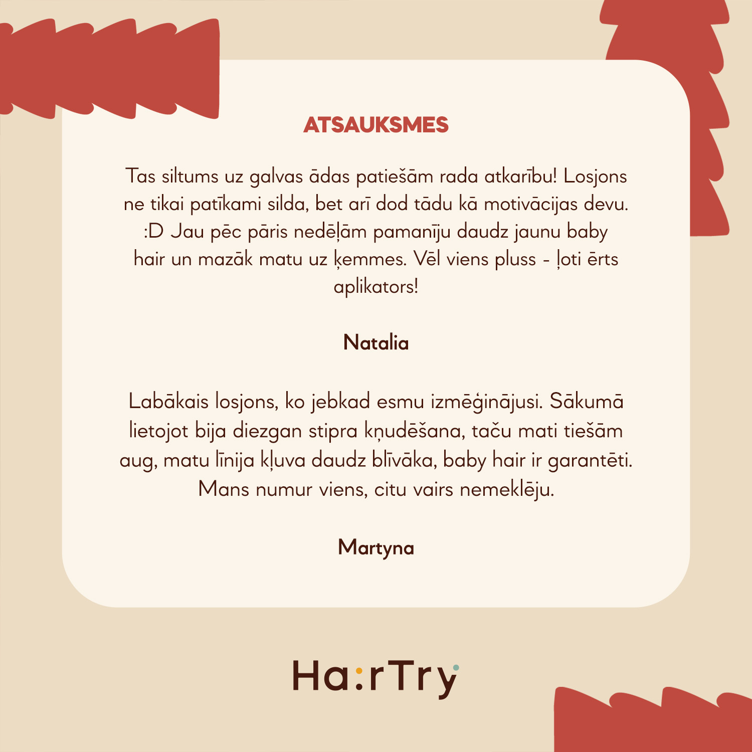 - Vanililbutilēteris - sildoša sastāvdaļa, aktivizē matu augšanu un uzlabo galvas ādas mikrocirkulāciju.