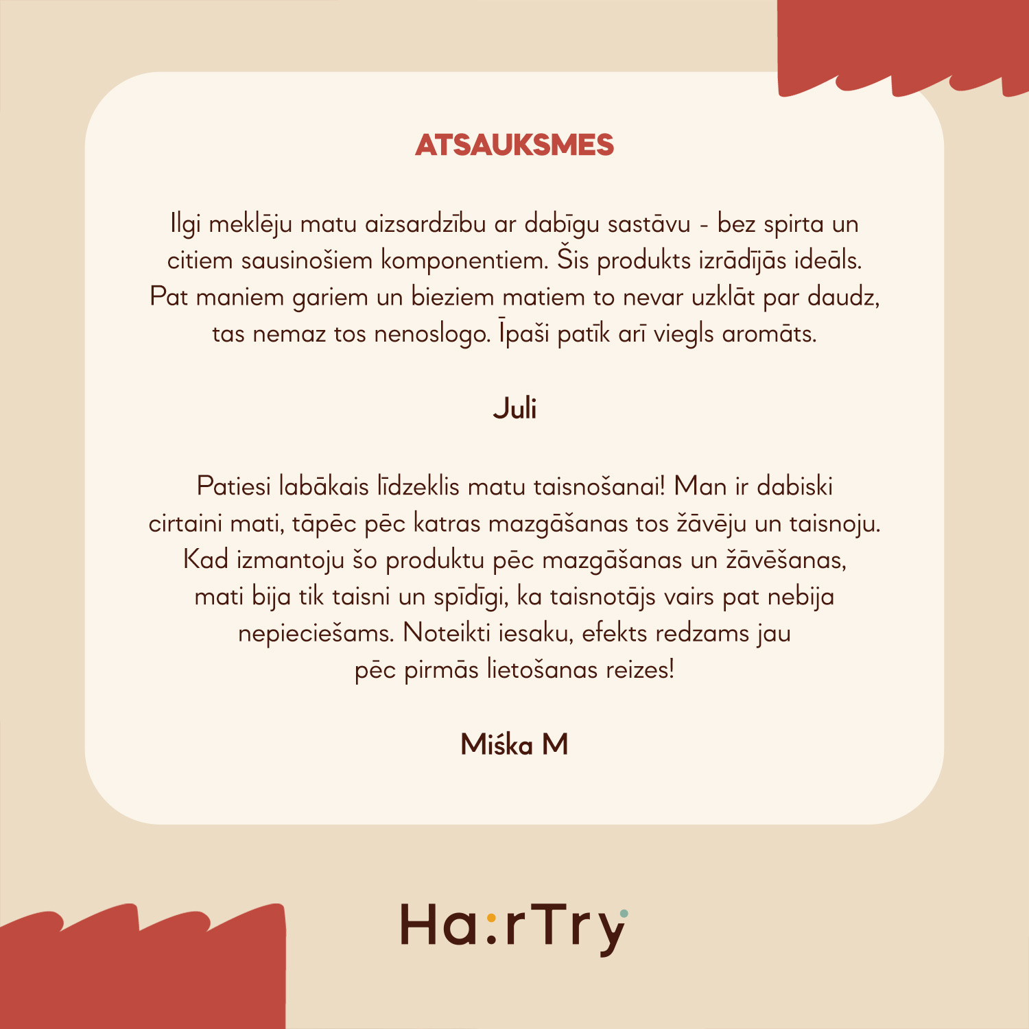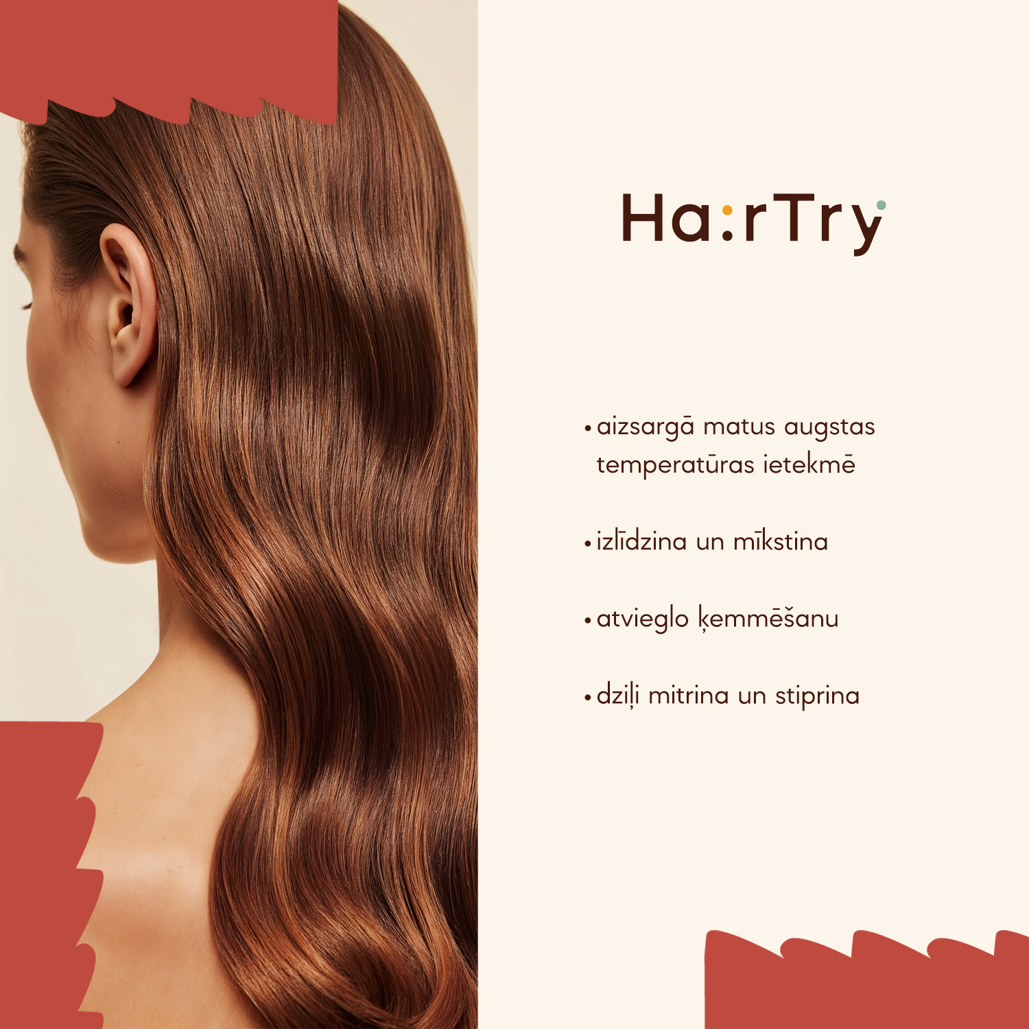 HairTry - Heat Lock - kondicionieris bez skalošanas ar divfāžu struktūru, kas apvieno sevī izlīdzināšanu un termisko aizsardzību līdz pat 230 grādiem pēc Celsija. Heat Lock kondicionieris satur kosmētikas produkta ar termoaizsardzības funkciju trīs priekšrocības - produkta regulāra lietošana nodrošina profilaktiskas īpašības pret augstas temperatūras radītiem bojājumiem, garantē labākus matu ieveidošanas rezultātus, padarot matus mīkstus un zīdainus, kā arī palīdz uzturēt atbilstošu matu mitrināšanas līmeni. Formula, kas izstrādāta uz KERATRIX™ bāzes – savienojuma ar pagarinātu izdalīšanās laiku, kas satur peptīdus un aminoskābes, kas ir atbildīgas par matu ārējā slāņa palielinātu noturību un stiprināšanu. Silikoni un Polyquaternium-7 veido okluzīvu slāni uz matu stiebra virsmas, pasargājot no ūdens izplūšanas no šķipsnu iekšpuses, kā arī novēršot mehāniskus bojājumus, kam ir degradējoša ietekme uz veidošanu vai krāsošanu. Hidrolizētie kviešu proteīni iekļūst matu slāņos, nostiprinot tos no iekšpuses, spēj piesaistīt un noturēt mitrumu, kā arī samazina matu berzi un trauslumu. Saturu papildina pantenols, kas matus pēc produkta lietošanas padara mīkstus un gludus. Kondicionierim ir patīkams ziedu aromāts, un tā formula ir vegāniska. Aizsardzības vērtība tika pārbaudīta neatkarīgā laboratorijā un rezultāti parādīja, ka produkts nerada raksturīgas termiskās deformācijas matu kutikulā, kas savukārt ir redzamas bez termiskās aizsardzības. Mēs rūpējamies ne tikai par Taviem matiem, bet arī par planētu - atbalstām iniciatīvu Ocean Waste Plastic un fondu SeedBalls Kenya, kas palīdz pārstrādāt plastmasu un atdzīvināt zaļās teritorijas. Izvēloties mūsu kosmētiku, Tu samazini atkritumu daudzumu un atbalsti apzaļumošanu - maini pasauli uz labāku kopā ar mums!