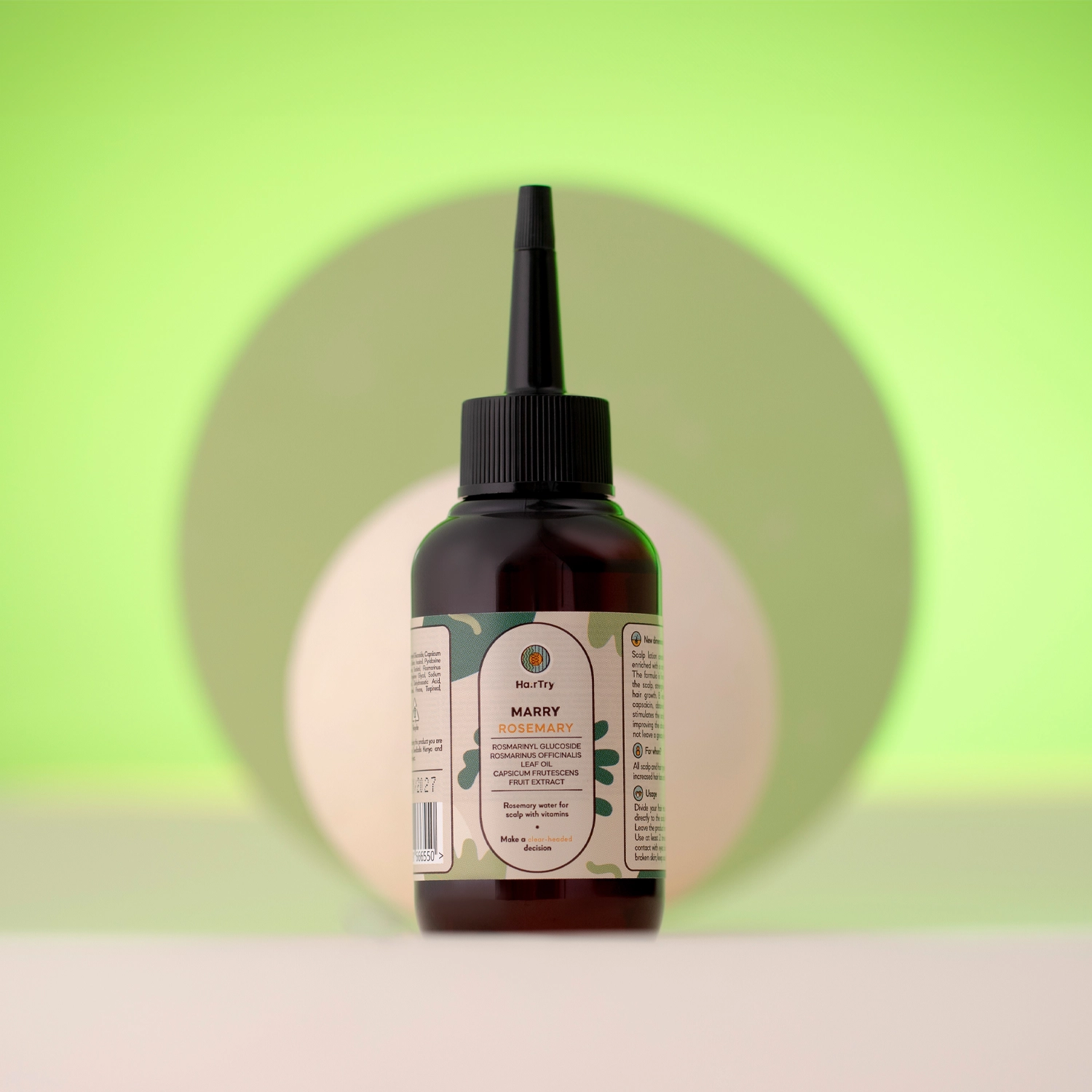 HairTry - Marry Rosemary - galvas ādas līdzeklis ar visaptverošu iedarbību uz galvas ādu un matiem. Pateicoties rozmarīna eļļai un kapsaicīnam, produkts dabiski stimulē mikrocirkulāciju matu folikulā un matu sīpola iekšienē, ietekmējot to barošanu, skābekļa piesātināšanu un labāku gan jauno matu, gan jau esošo šķipsnu augšanu. Turklāt B vitamīnu komplekss, tostarp niacīnamīds un biotīns, nodrošina daudzdimensionālu galvas ādas un matu kopšanu. Tas rūpējas par sebuma sekrēcijas regulēšanu, tādējādi ierobežojot matu taukošanās problēmu, stiprina epidermas barjeru, veldzē un nomierina kairinājumus un mazina nepatīkamo galvas ādas niezi. Sastāvs ir bagātināts ar rozmarīna glikozīdu, kas novērš galvas ādas novecošanos, veicina atjaunošanu un novērš matu izkrišanu. Rezultātā visu sastāvdaļu kombinācija rada vieglu, nenoslogojošu sajūtu matiem, ar garšaugu un rozmarīna aromātu un sildošu, matu augšanu stimulējošu, sebumu regulējošu, pretiekaisuma un mitrinošu iedarbību. Līdzeklis ieteicams novājinātiem matiem, matiem ar lēnu augšanu, kairinājumiem un niezi, taukainiem vai plāniem matiem. Produktam ir ērts aplikators pudelītē un ir piemērots arī vegāniem un veģetāriešiem. Lai kompensētu izmantoto plastmasu, HairTry zīmols atbalsta tādas vides iniciatīvas kā Seedballs Kenya un ReSea Project, padarot produktu par ētiskāku izvēli.