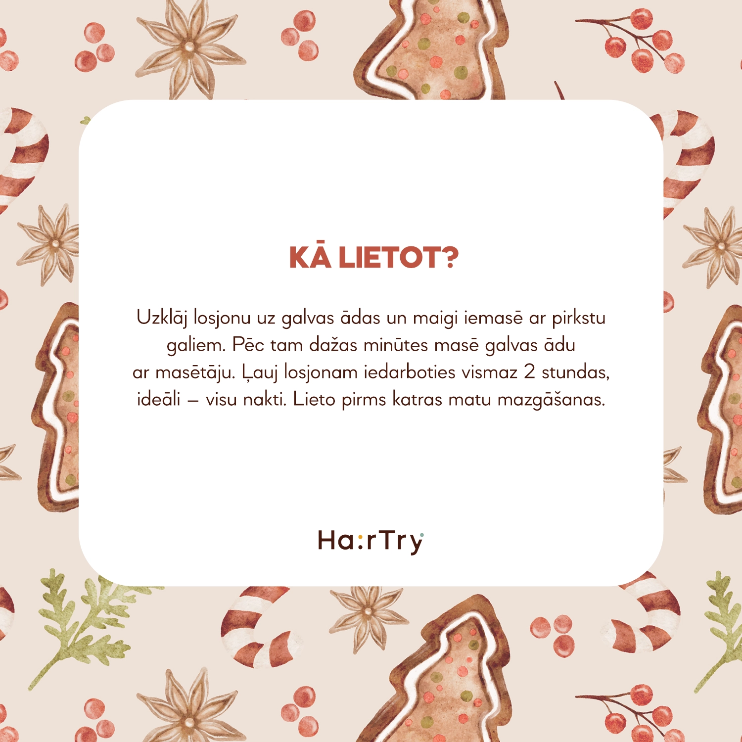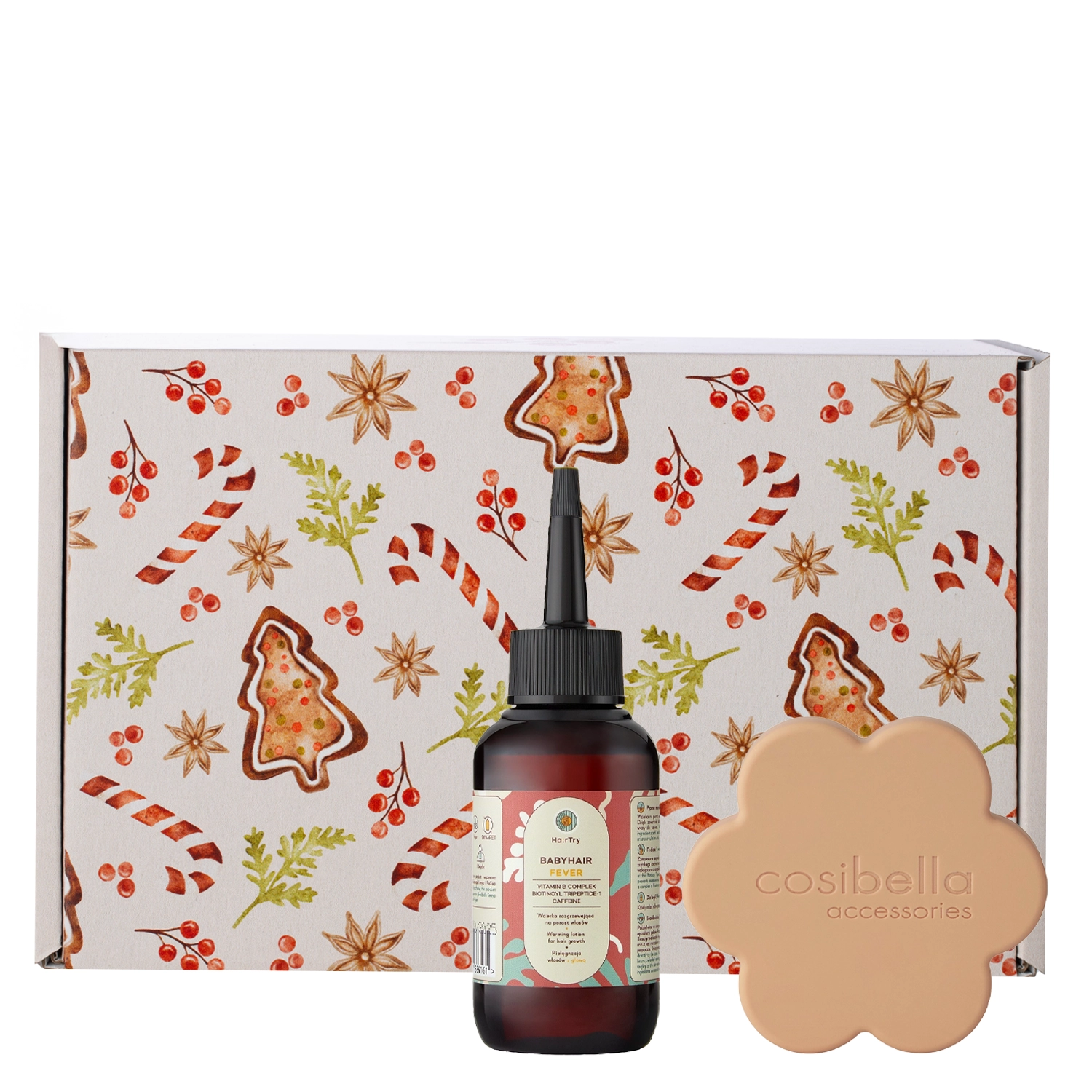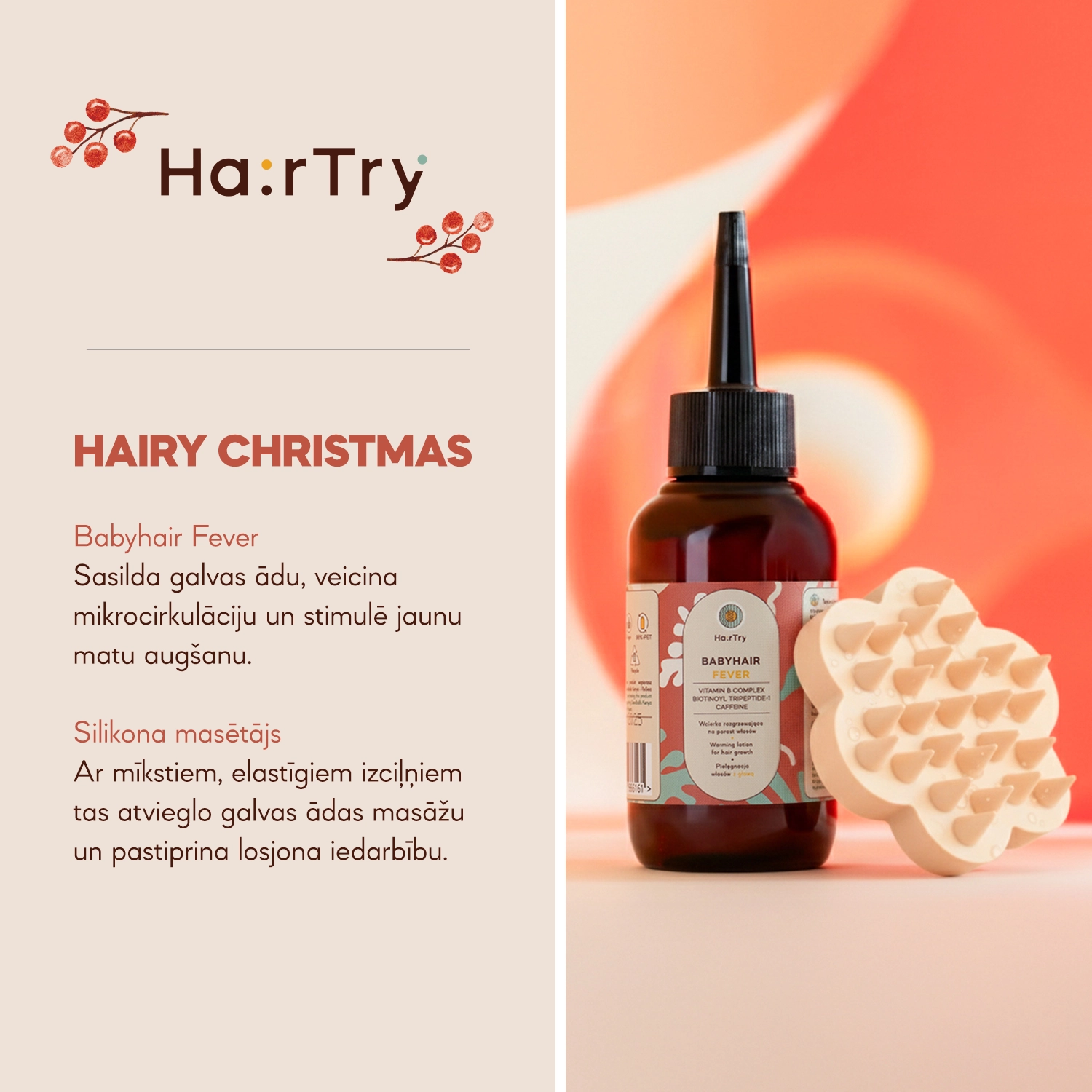 HairTry - Komplekts "Hairy Christmas" - komplekts galvas ādas kopšanai, kas paredzēts pārmērīgas matu izkrišanas, lēnas augšanas un apjoma zuduma novēršanai. Losjons "Babyhair Fever" stimulē jaunu matiņu augšanu un palīdz mazināt matu izkrišanu, savukārt Cosibella Accessories silikona masieris atvieglo līdzekļa uzklāšanu uz galvas ādas un ir lieliski piemērots arī ikdienas lietošanai šampūna iemasēšanai un galvas ādas masāžai. Komplekts iepakots svētku noformējuma kastītē, kas padara to par lielisku dāvanu zem eglītes cilvēkiem ar noslieci uz frizūras apjoma mazināšanos un pastiprinātu matu izkrišanu.