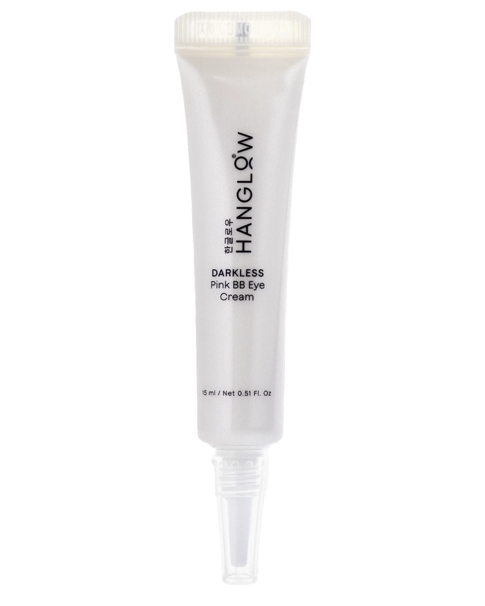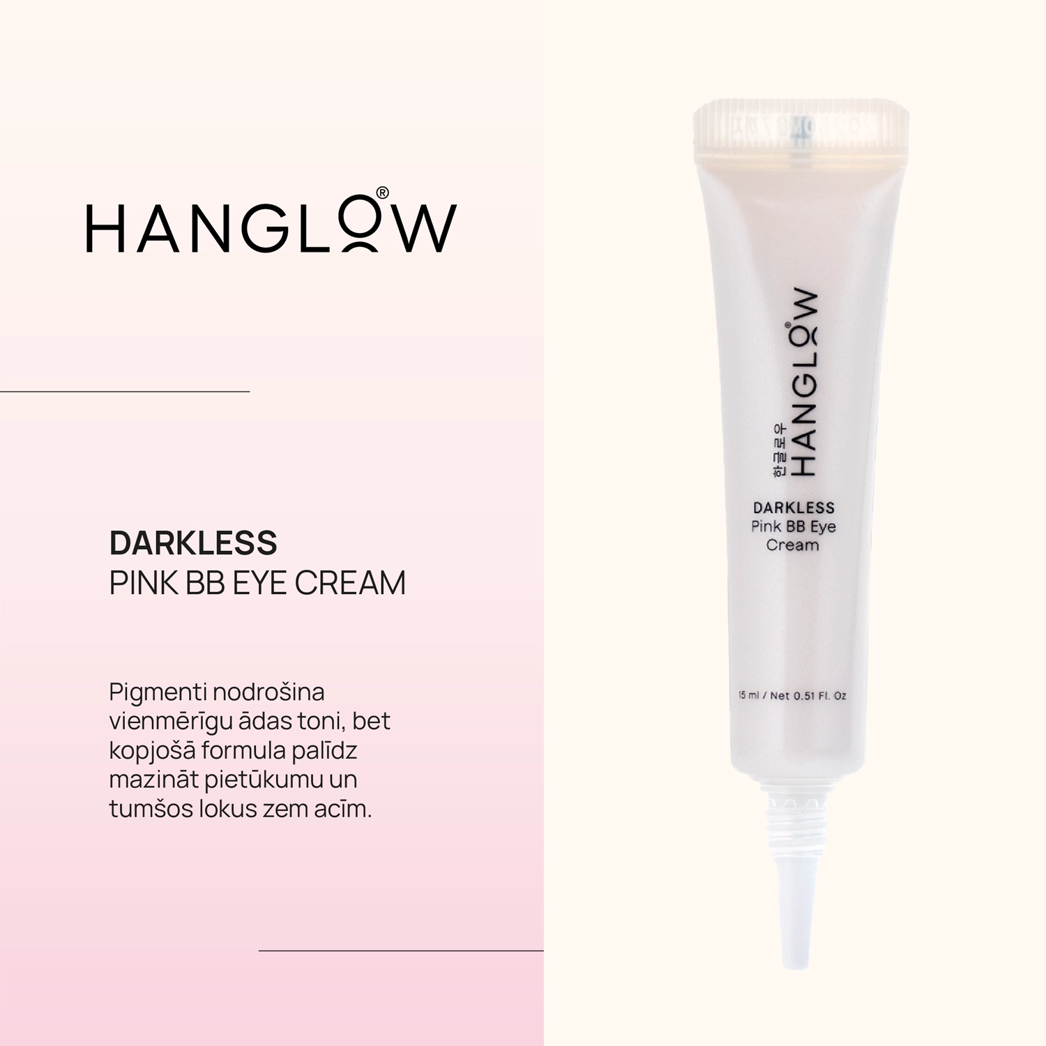 HanGlow - Darkless - Pink BB Eye Cream - viegls acu krēms, kas labi iesūcas ādā un nerada smaguma sajūtu. Nodrošina maigu mitrinošu, kopjošu un izgaismojošu efektu. Krēma maigi koraļļu un smilškrāsas pigmenti maskē tumšos lokus un izlīdzina ādas toni, piešķirot acu zonai svaigu un starojošu izskatu bez nepieciešamības pēc grima. Formulā apvienots idebenons (sintētisks koenzīma Q10 analogs) un argirelīns - neiropeptīds, kas palīdz cīnīties ar novecošanās pazīmēm, samazina brīvo radikāļu kaitīgo ietekmi un piešķir ādai maigu liftinga efektu, izlīdzinot smalkās grumbiņas acu zonā. Sastāvu papildina kofeīns, pateicoties kuram regulāra krēma lietošana samazina pietūkumu un tumšos lokus. Krēms ir gandrīz nemanāms uz ādas un neakcentē nelīdzenumus. Lieliska alternatīva smagajam acu grimam - izgaismojošs finišs bez noguruma pazīmēm. Produkts ir vegānisks.