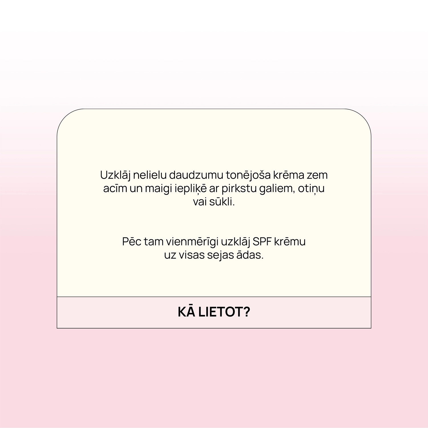 - Darkless - Pink BB Eye Cream – uzklāj nelielu daudzumu krēma zem acīm. Maigi iepliķē ar pirkstu galiem.