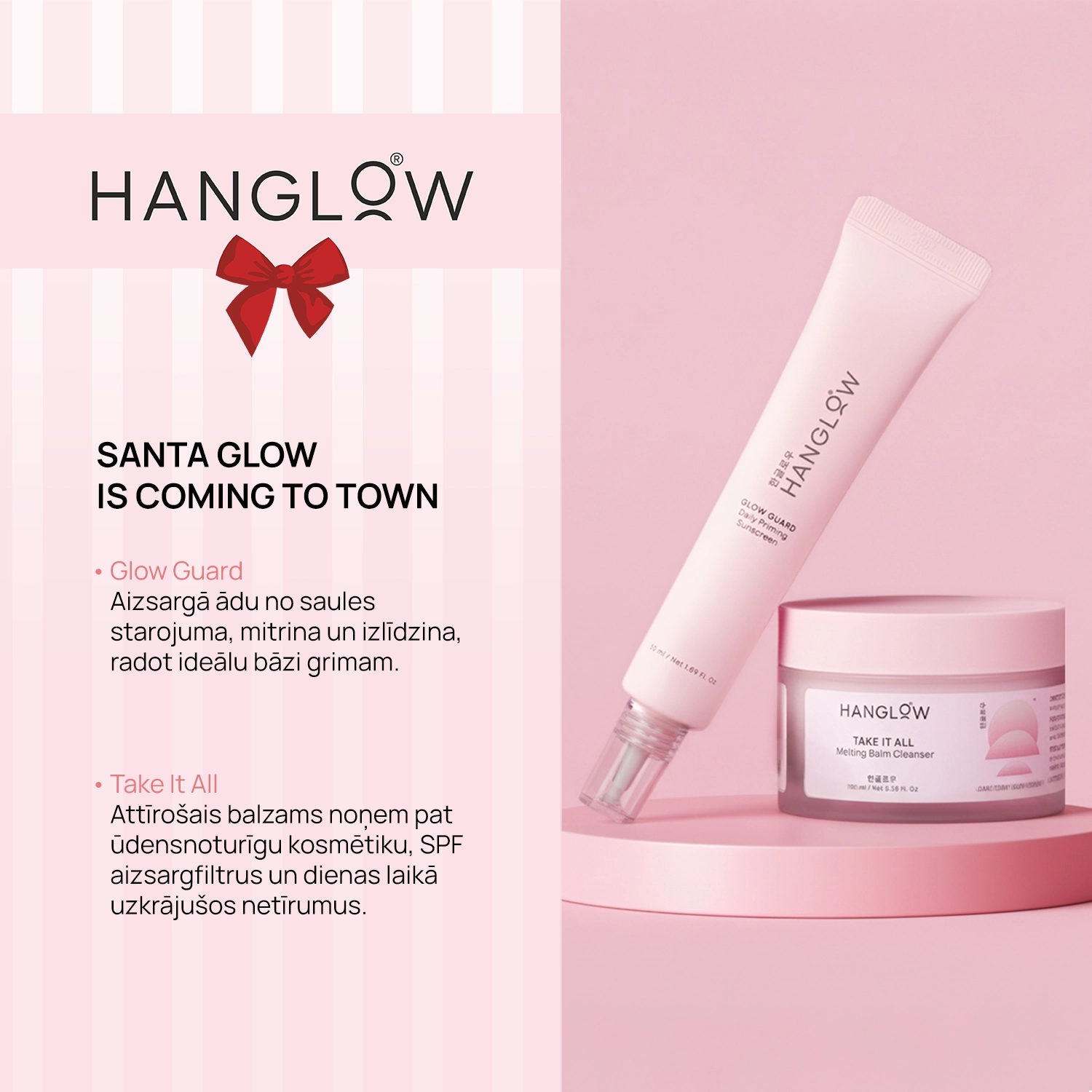 - HanGlow - Take It All - Melting Balm Cleanser – attīrošs balzams, kas efektīvi noņem kosmētiku (arī ūdensnoturīgo), SPF krēmu un citus netīrumus, atstājot ādu tīru un atsvaidzinātu. Saskaroties ar ūdeni, tas viegli emulģējas, un pēc noskalošanas neatstāj jūtamu kārtiņu uz ādas. Formula, bagātināta ar Āzijas centellas ekstraktu un rūgta apelsīna ziedu ekstraktu, nodrošina nomierinošu un pretiekaisuma iedarbību. Maigā, krēmīgā tekstūra ir piemērota arī jutīgajai acu zonai. Tilpums: 100 ml.