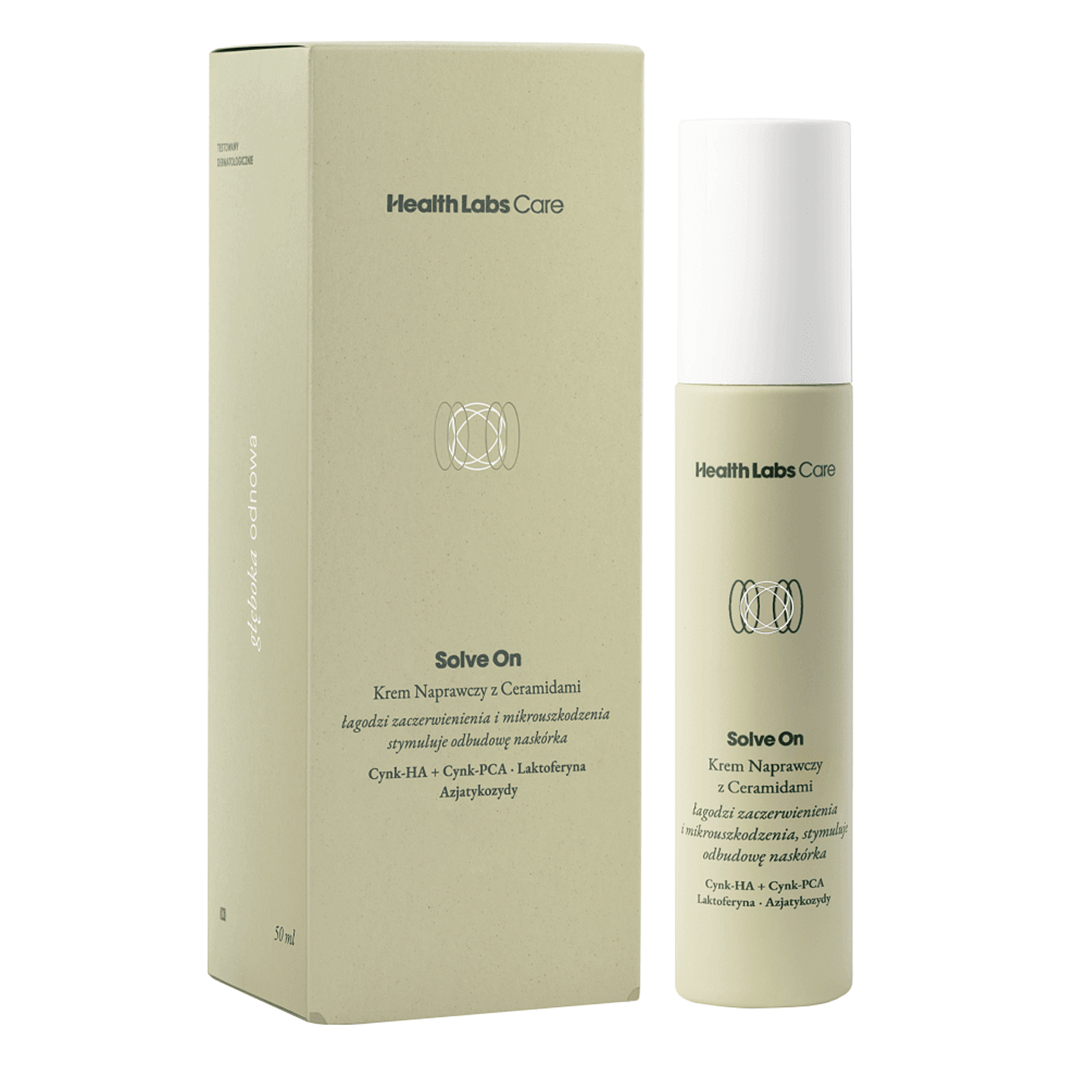 Health LabsCare - Solve On - sejas krēms, kas atbalsta hidrolipīdu barjeru. Pateicoties pantenolam, āda iegūst maigumu un elastību un ir spēcīgi mitrināta. Keramīdi, savukārt spēlē galveno lomu dabiskās aizsargbarjeras stiprināšanā, kas novērš mitruma zudumu un sniedz ādai atvieglojumu. Cinka PCA palīdz mazināt iekaisumu un nomierinoši iedarbojas uz kairinājumu. Laktoferīns veicina ādas veselīgu izskatu, atvieglojot nelielu ievainojumu dzīšanu, betCentella Asiatica ekstraktam ir antibakteriāla iedarbība un tas veicina reģenerāciju.