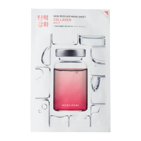 Holika Holika - Skin Rescuer Mask Sheet - Collagen - liftinga auduma maska, bagātināta ar hidrolizētu kolagēnu, kas atjauno ādas elastību, izlīdzina un mīkstina ādu. Pateicoties hialuronskābei un arginīnam, āda būs dziļi mitrināta un barota. Līdzekļa sastāvā ir arī gotu kolas ekstrakts un kumelīšu ekstrakts, kas nomierina kairinājumus un remdē iekaisumus.