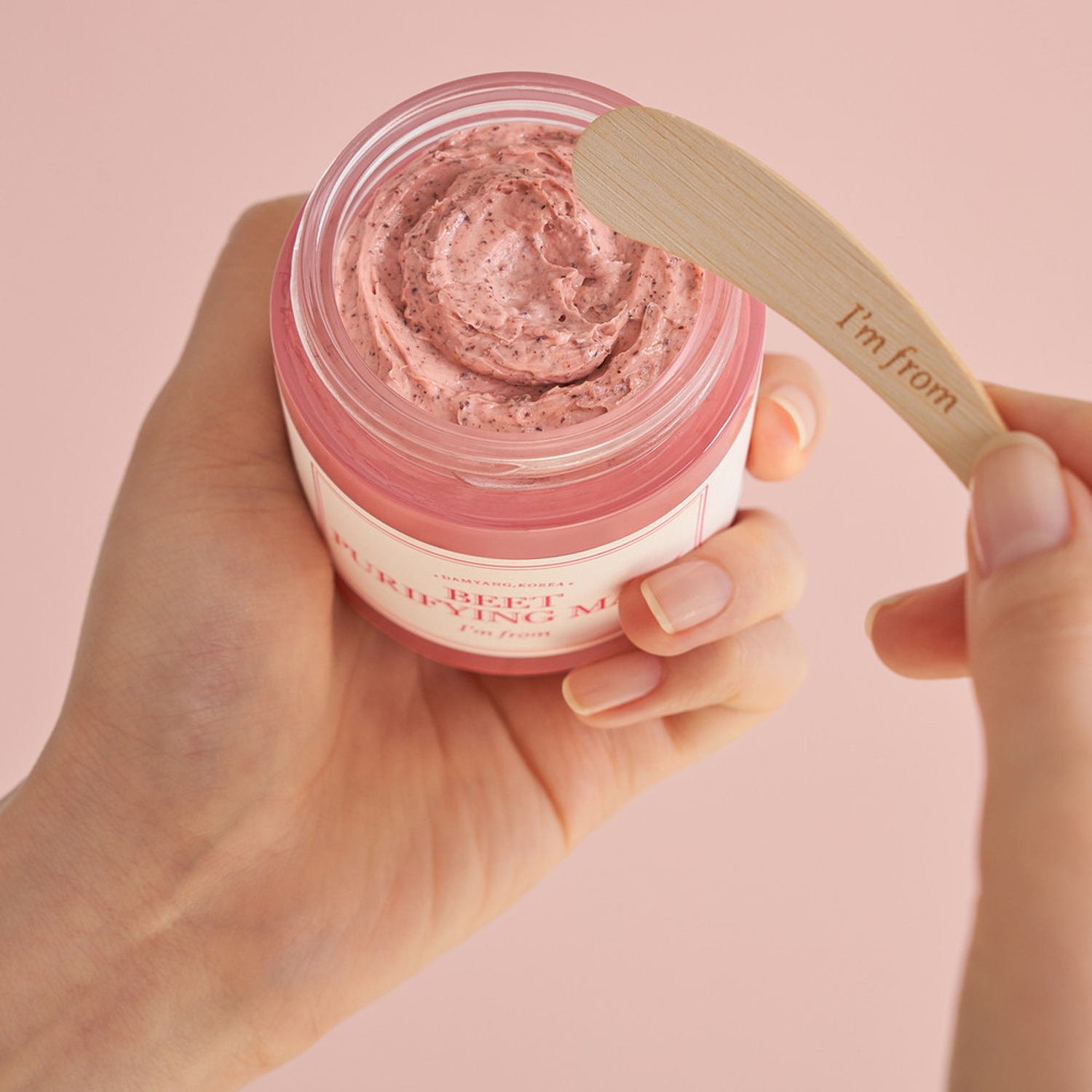 I'm From - Beet Purifying Mask - sejas maska ar attīrošām un nomierinošām īpašībām. Šī produkta sastāvā atradīsiet mālu, kas ir pazīstams ar savu spēju absorbēt sebumu un samazināt poru izskatu. Turklāt tā izlīdzina un matē ādu, vienlaikus nomierinot to un mazinot jebkādus iekaisumus. Biešu ekstrakts darbojas kā intensīvs mitrinātājs, padarot ādu maigu un atjaunojot tās dabisko mirdzumu. Glikoonolaktons darbojas kā antioksidants, neitralizējot kaitīgos brīvos radikāļus un veicinot kolagēna un elastīna veidošanos, kas labvēlīgi ietekmē ādas novecošanās procesu aizkavēšanu un paātrina reģenerācijas un dzīšanas procesu. Savukārt pantenols nomierinoši iedarbojas uz ādu, veicinot tās dziedināšanu, nomierinot kairinājumu un nodrošinot intensīvu mitrināšanu.
