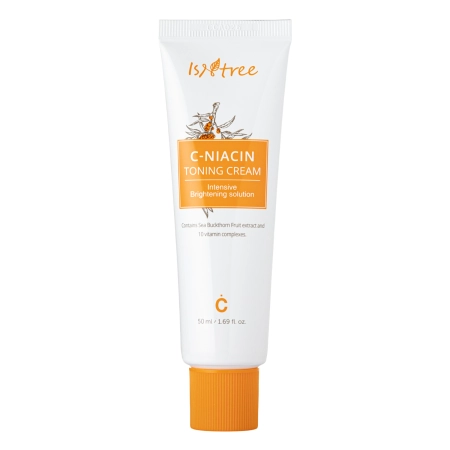 Viegla krēmželeja ar C vitamīnu un smiltsērkšķu augļu ekstraktuIsntree - C-Niacin Toning Cream - krēms ar želejas konsistenci, kam piemīt izgaismojoša un antioksidanta īpašības, pateicoties saturā esošam niacinamīdam un C vitamīna atvasinājumam. Šīs sastāvdaļas izlīdzina ādas toni, izgaismo pelēko un blāvu ādu, kā arī stiprina epidermas barjeru. Smiltsērkšķu augļu ekstrakta un smiltsērkšķu augļu eļļas piedevai ir mitrinoša un barojoša iedarbība, bet mango sviests atbalsta šo efektu, vienlaikus iedarbojas pretnovecošanos. Krēmam ir maigs dzelteni-oranžs tonis un viegla, ātri iesūcoša formula. Pēc lietošanas āda iegūst maigu mirdzumu.