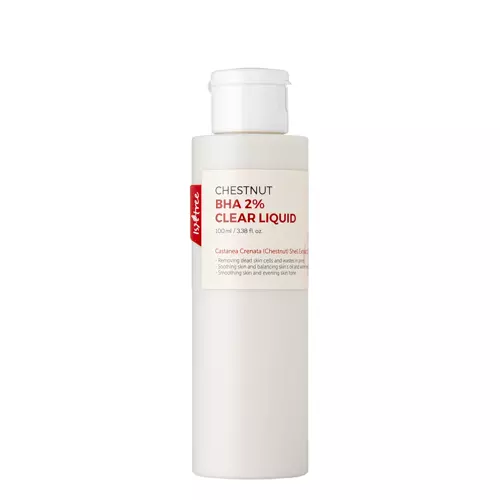 Isntree - Chestnut BHA 2% Clear Liquid - eksfoliējošs šķidrums ar salicilskābi 2% koncentrācijā, kas efektīvi pīlingo atmirušo ādu, attīra tauku dziedzeru izdalnes un izlīdzina ādas toni, vienlaikus samazinot paplašinātu poru izskatu. Tā sastāvā ir arī kastaņu ekstrakts, kas mazina apsārtumu, un 3 veidu hialuronskābe, kas nodrošina ādai mitrināšanas devu. Pēc līdzekļa lietošanas sejas āda kļūst patīkami gluda.