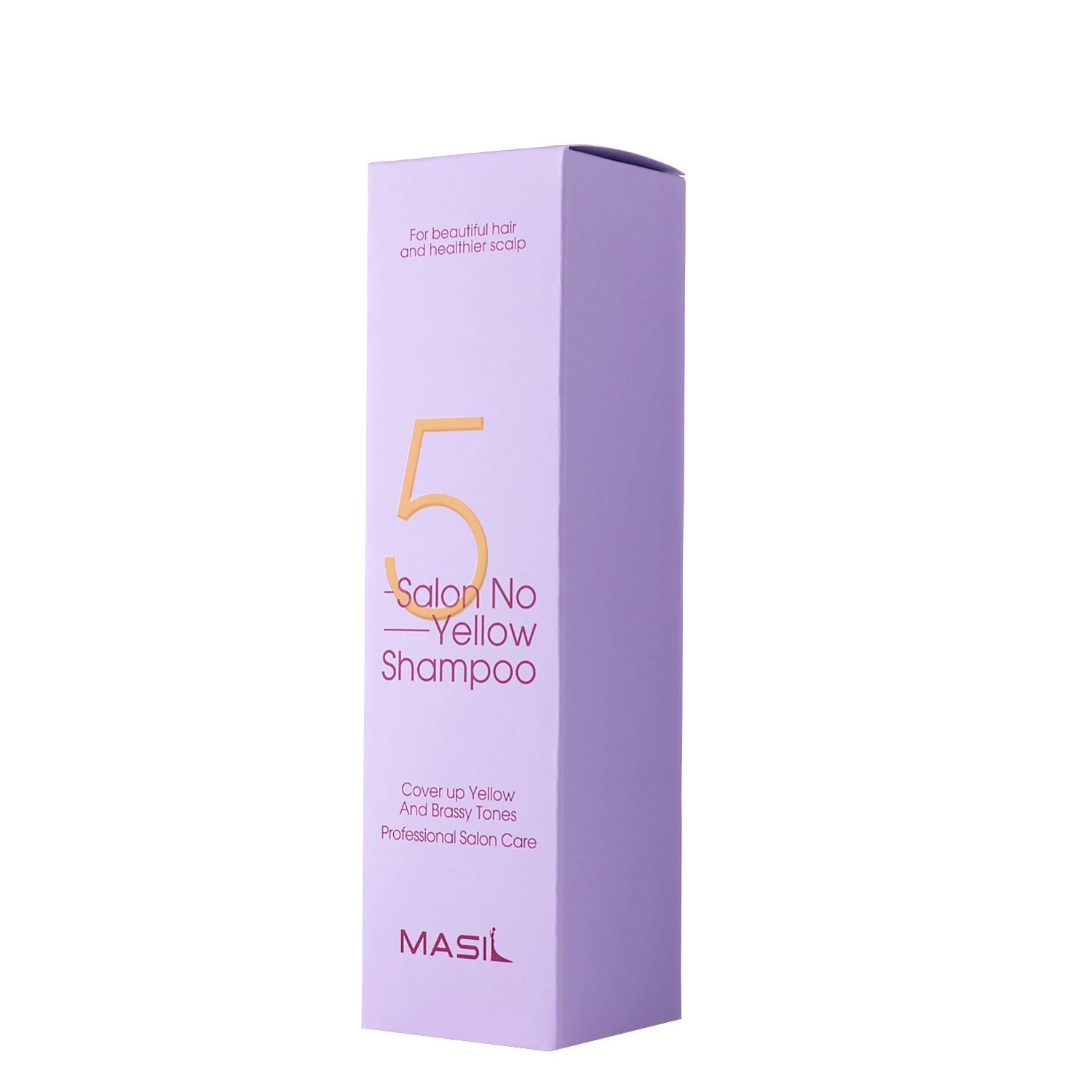 Masil - 5 Salon No Yellow Shampoo - tonējošs šampūns, kas izstrādāts īpaši krāsotu un balinātu matu kopšanai. Tas palīdz pagarināt krāsas noturību, neitralizē dzeltenos toņus un piešķir matiem vēsāku nokrāsu. Šampūns arī nogludina matus, piešķir spīdumu un atvieglo to ieveidošanu. Formula ir bagātināta ar bišu māšu peru pieniņa ekstraktu un vīnogu ekstraktu, kas mitrina un baro gan matu šķipsnas, gan saknes. Avokado ekstrakts uzlabo elastību, savukārt pantenols palīdz nomierināt galvas ādu un samazina kairinājumu. Papildu priekšrocību nodrošina Lactobacillus ferments, kas atbalsta galvas ādas mikrobiomu, darbojas pretiekaisuma veidā un regulē sebuma izdalīšanos. Šampūnam ir gēlveida konsistence un violeta krāsa, kas nekrāso matus. Produkts nesatur silikonus un sulfātus, bet tā pH līmenis ir nedaudz skābs. Pēc lietošanas mati kļūst mīksti un atsvaidzināti, bet to tonis – patīkami atvēsināts.