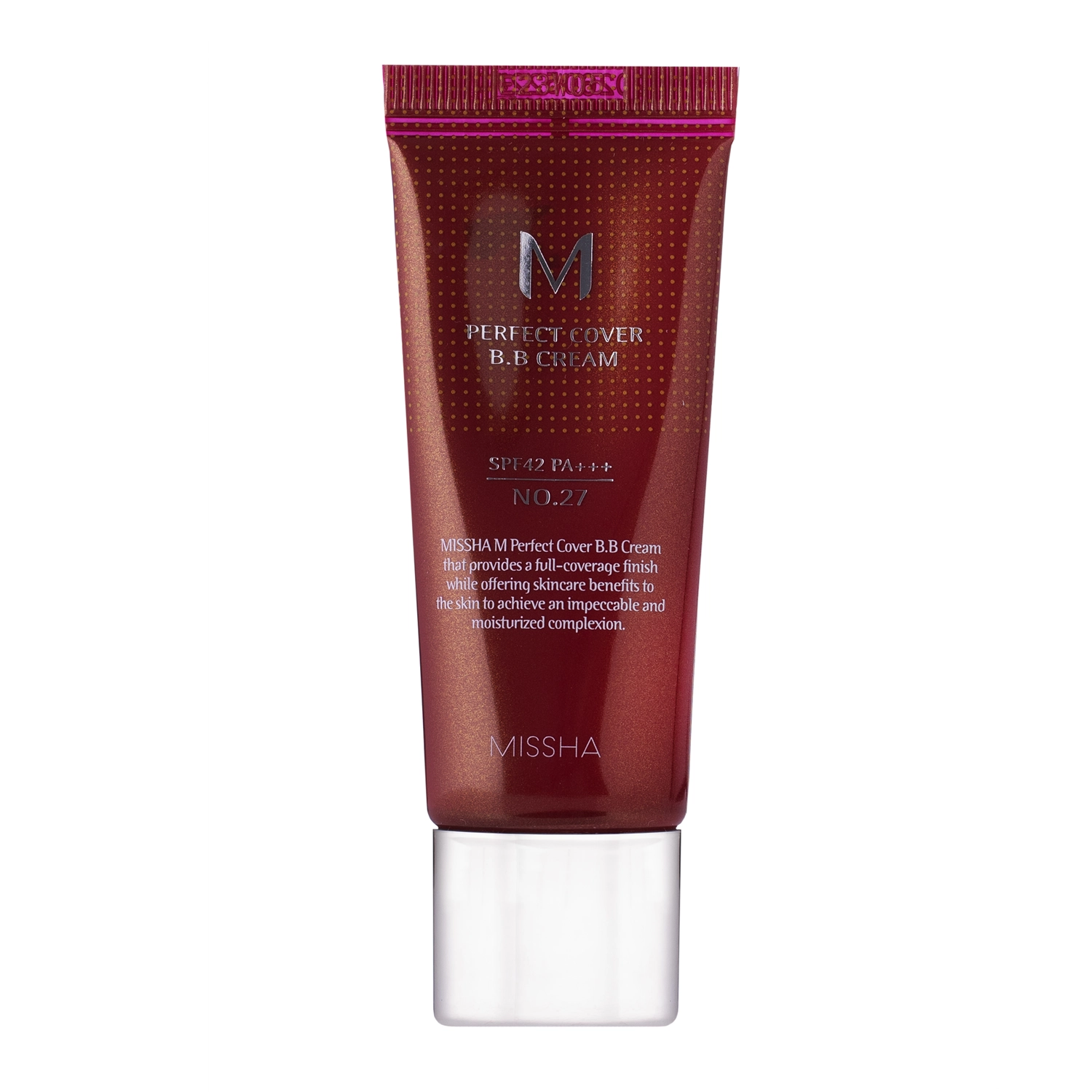 Missha - M Perfect Cover BB krēms SPF42/PA+++ - Nr. 27 Honey Beige - BB krēms, kas efektīvi noslēpj ādas nepilnības, atstājot uz ādas dabisku, satīnainu finišu. Krēma sastāvs ir bagātināts ar UV filtriem, kas aizsargā ādu no kaitīgajiem UVA un UVB stariem, un mežrozīšu eļļu, kas nodrošina barošanu un izlīdzina ādas toni. Produktam ir patīkama, krēmīga konsistence.