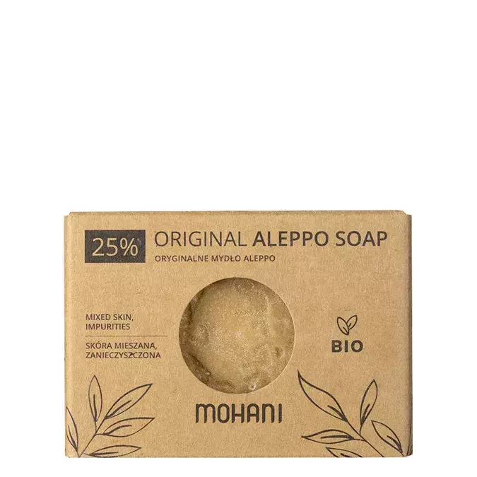 Mohani - Bio - Original Aleppo Soap 25% - dabīgas, tradicionālās ziepes gabaliņā, ražotas Sīrijā. Tās tiek iegūtas, reaģējot taukiem ar nātrija hidroksīdu, tāpēc ziepju formulā ir dabīgas augu eļļas - olīveļļa un lauru eļļa - kā arī nātrija hidroksīds. Gan olīveļļai, gan lauru eļļai piemīt attīrošas īpašības - tās efektīvi noņem netīrumus no ādas virsmas, vienlaikus palīdzot ādu mīkstināt, kondicionēt un pabarot. Lauru eļļai piemīt arī antibakteriāla iedarbība, un tās saturs šajās ziepēs ir 25%, tāpēc tās var būt piemērotas ikdienas roku mazgāšanai.