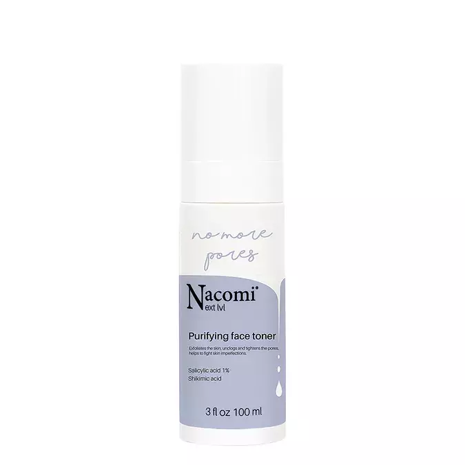 Nacomi - Next Level - Oczyszczający Tonik do Twarzy - tonik do cery tłustej, mieszanej i trądzikowej, który zawiera kwas salicylowy o działaniu złuszczającym i seboregulującym, kwas szikimowy, który wyrównuje koloryt cery i oczyszcza ujścia gruczołów łojowych oraz niacynamid łagodzący stany zapalne. W składzie znajduje się również regenerujący ekstrakt z korzenia prawoślazu i nawilżający ekstrakt z zielonej herbaty. Skóra po zastosowaniu toniku pozostaje wygładzona i oczyszczona. Cała receptura została skomponowana z surowców pochodzenia naturalnego.